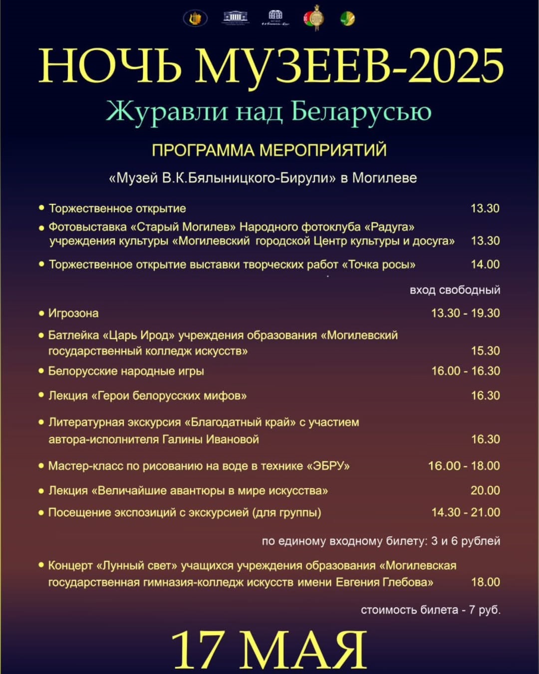 В Могилевском областном краеведческом музее (пл.Славы, 1) и музее этнографии (ул.Первомайская, 8) для горожан и гостей областного центра будут организованы мини-выставки, интерактивные зоны, игровые программы, викторины, квесты, концерты, экскурсии. Стать участниками мероприятий можно будет 16 мая с 18.00 до 23.30.