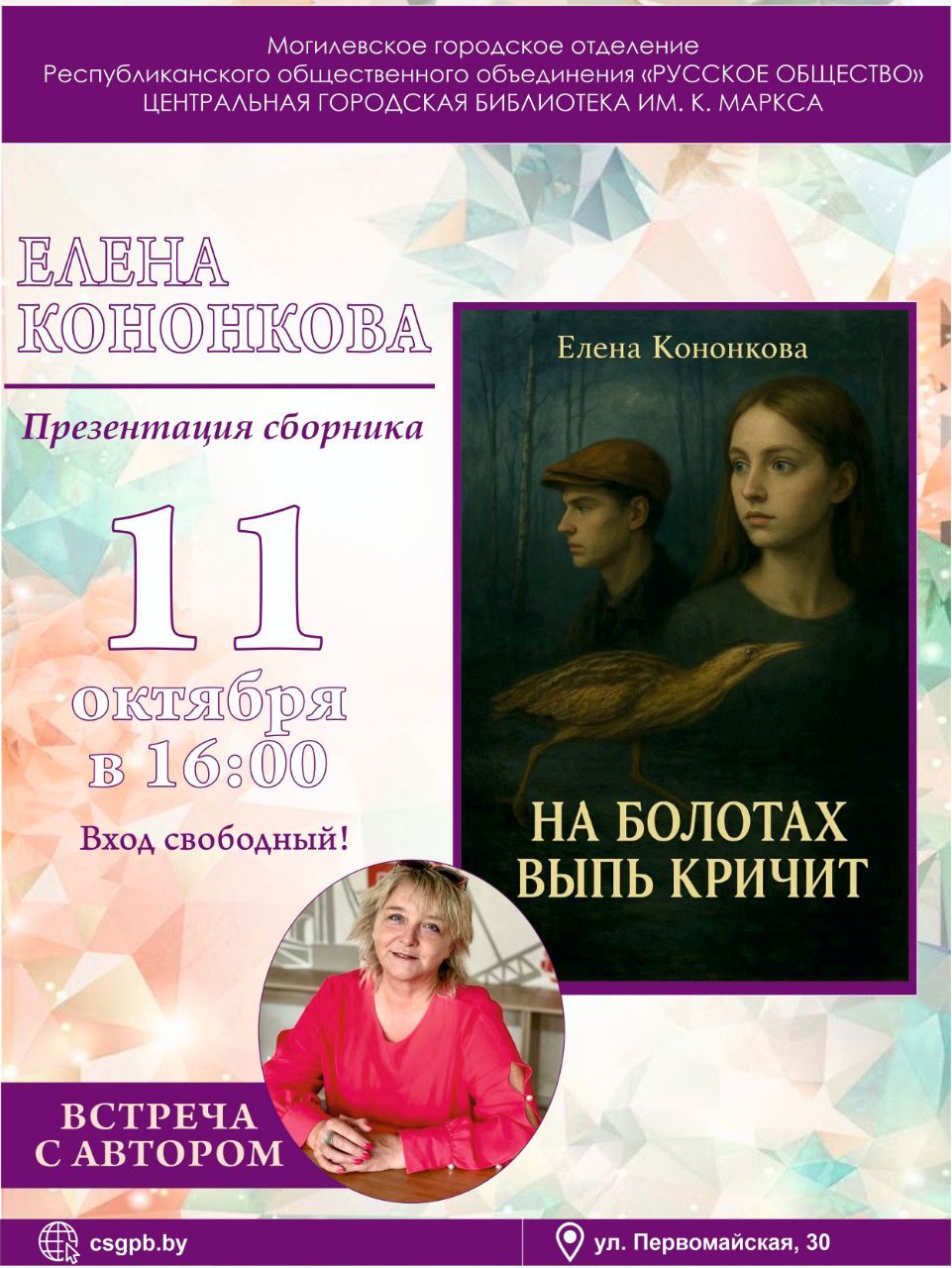 Творческая встреча с писательницей Еленой Кононковой пройдет в субботу, 11 октября, в Центральной городской библиотеке им. К.Маркса (ул.Первомайская, 30).
