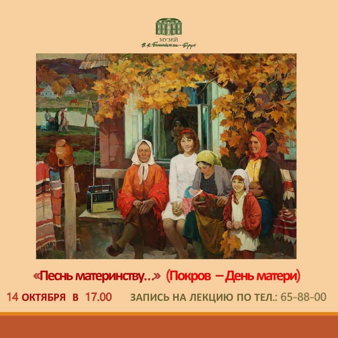 Тематическое мероприятие «Песнь Материнству...», посвященное Дню матери и Покрову Пресвятой Богородицы, состоится 14 октября в музее В.К.Бялыницкого-Бирули (ул.Ленинская, 37).