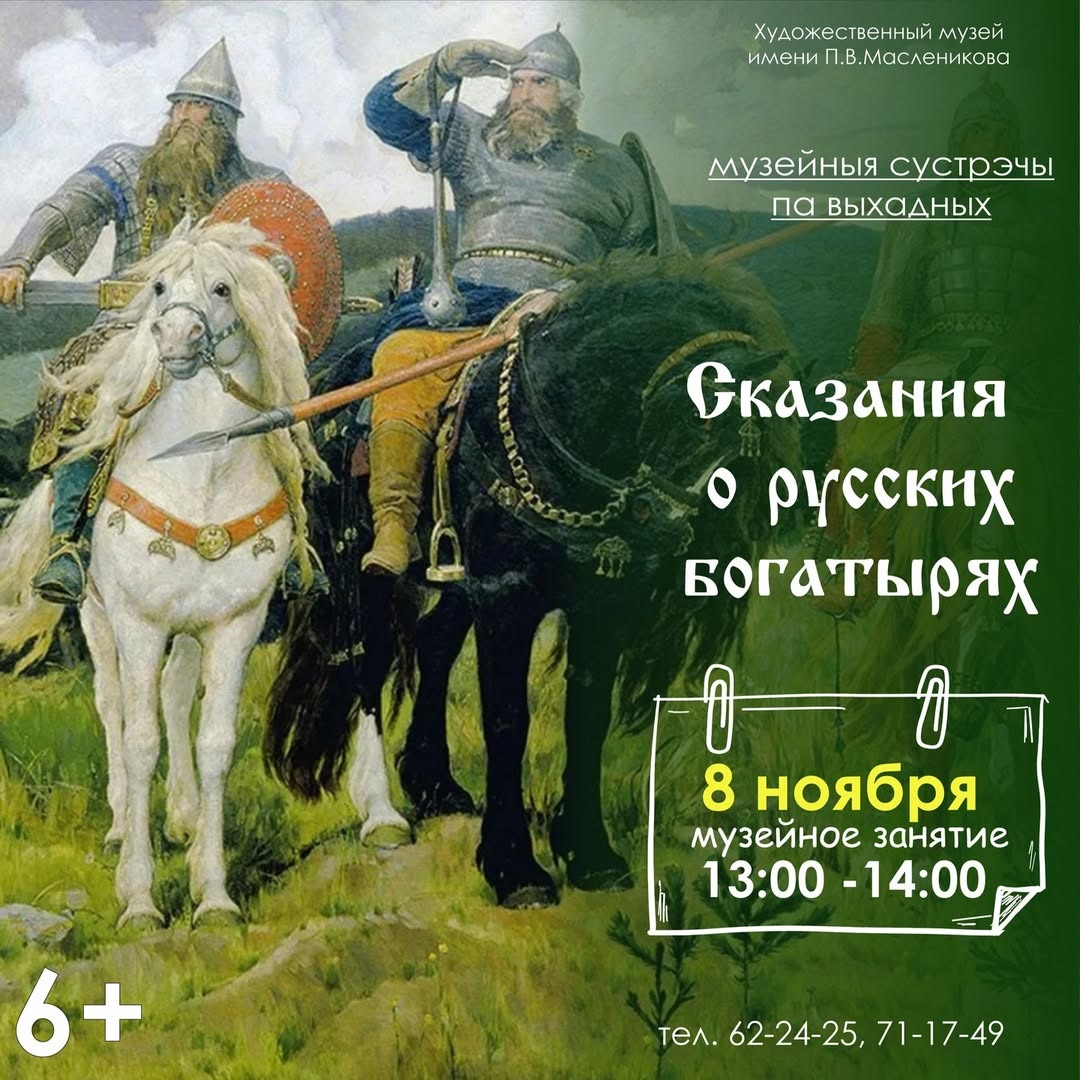 В субботу, 8 ноября, в учреждении культуры состоится интерактивное занятие «Сказание о русских богатырях», во время которого можно будет не только услышать увлекательный рассказ, но и попробовать себя в обличье древних воинов, а также сделать приятные памятные снимки. Начало занятия в 13:00.