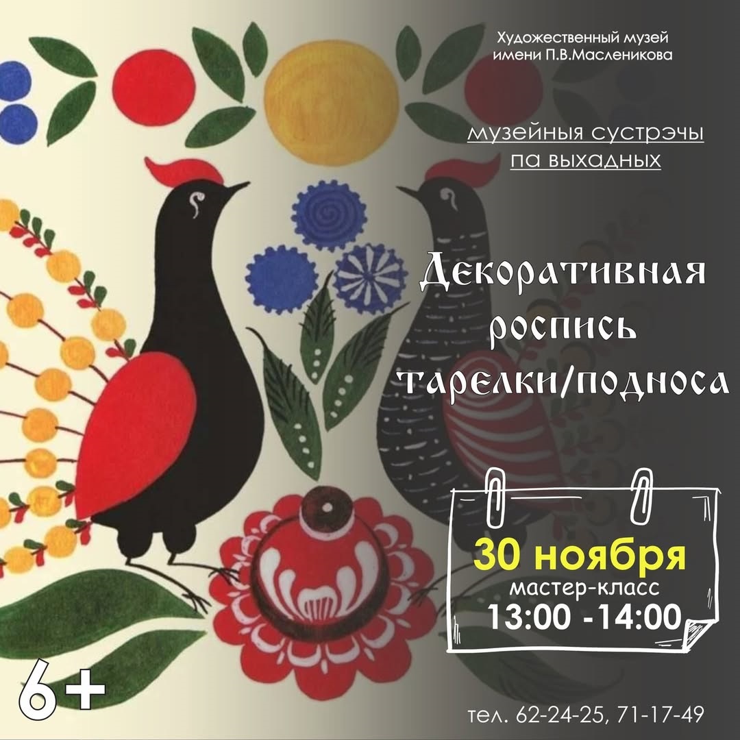 В воскресенье, 30 ноября, в музее запланирован мастер-класс по декоративной росписи. Участники мероприятия познакомятся с видами росписей, их элементами и колоритом, а также своими руками распишут тарелку-поднос. Начало в 13:00.