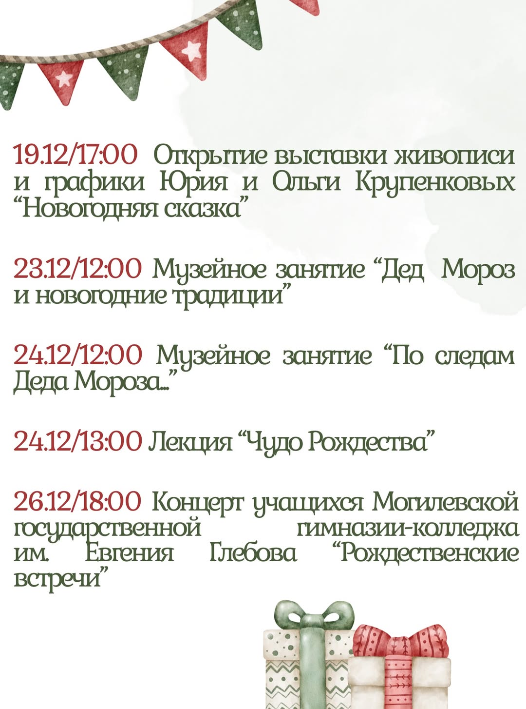 – 26 декабря в 18:00 – концерт учащихся Могилевской государственной гимназии-колледжа искусств имени Евгений Глебова «Рождественские встречи»;