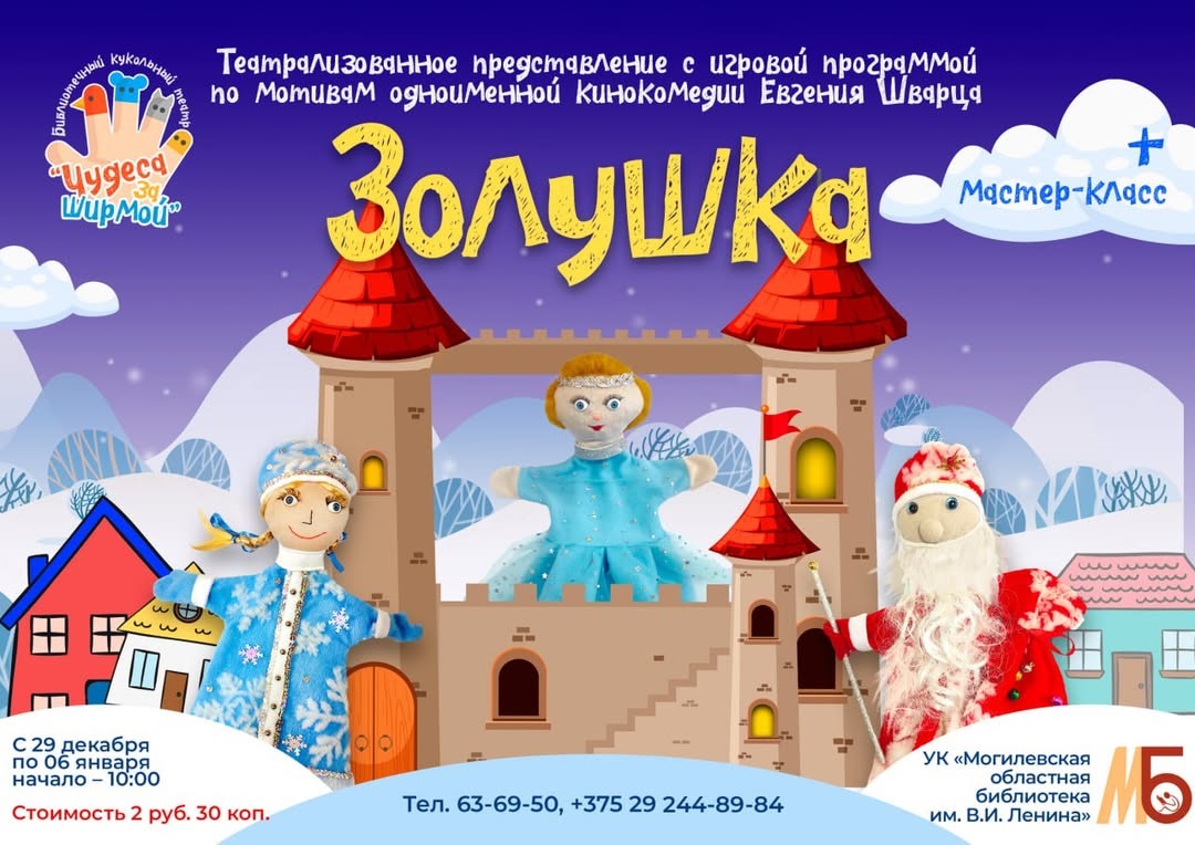 Могилевская областная библиотека им. В.И.Ленина приглашает юных горожан на увлекательное театрализованное представление по мотивам пьесы-сказки Евгения Шварца «Золушка», которое представит библиотечный кукольный театр «Чудеса за ширмой».