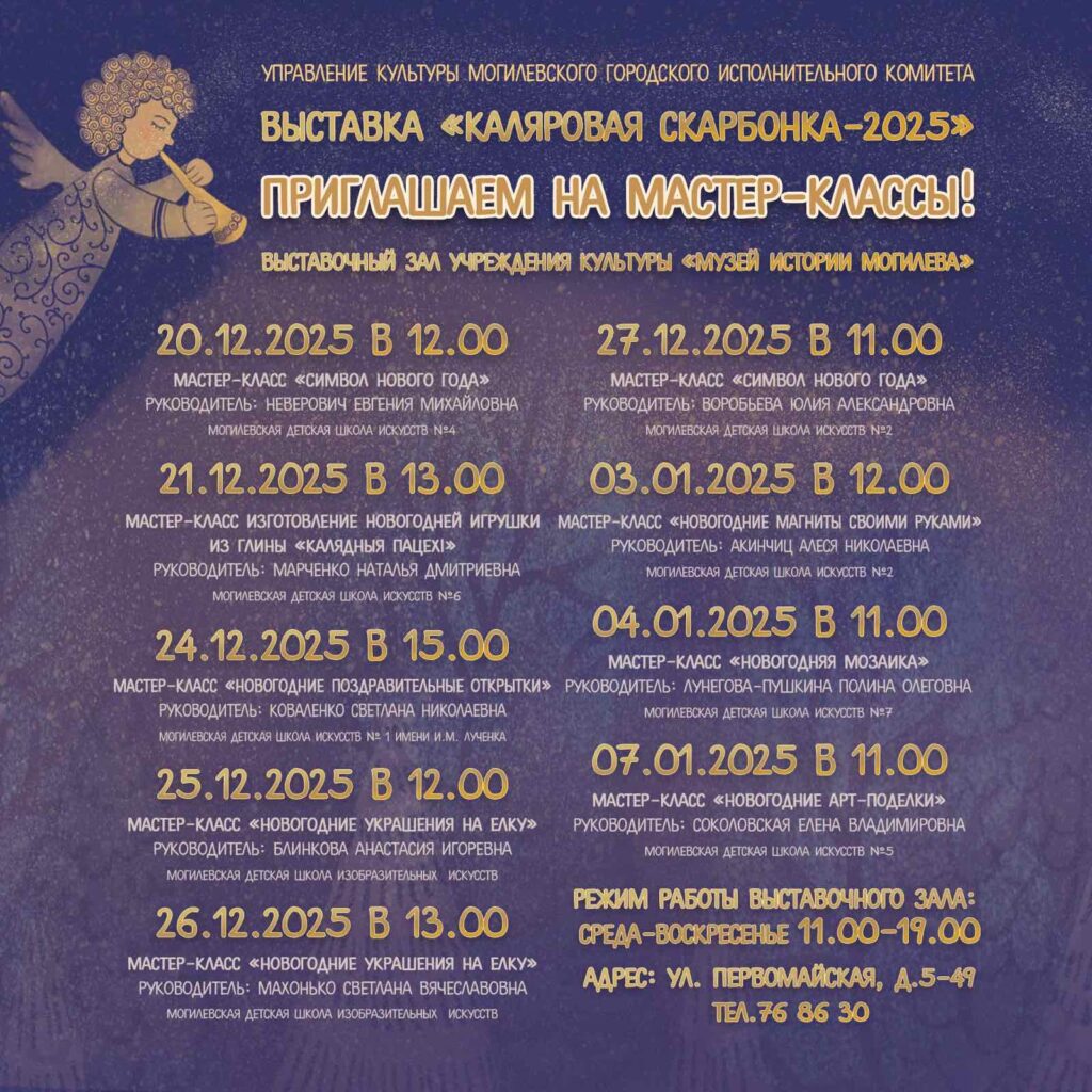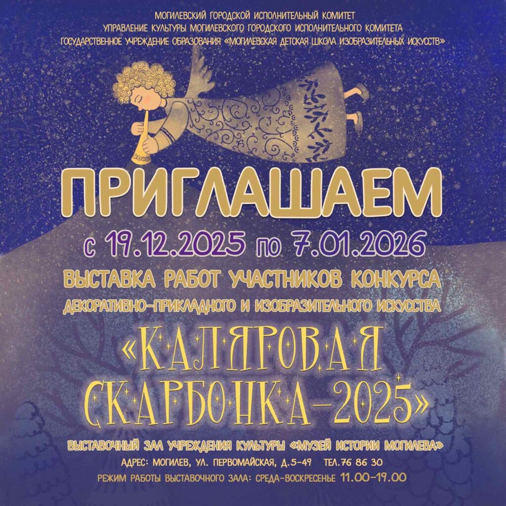 Также с 19 декабря по 7 января в выставочном зале Музея истории Могилева горожане смогут ознакомиться с выставкой, на которой представлены работы участников конкурса декоративно-прикладного и изобразительного искусства «Каляровая скарбонка-2025».