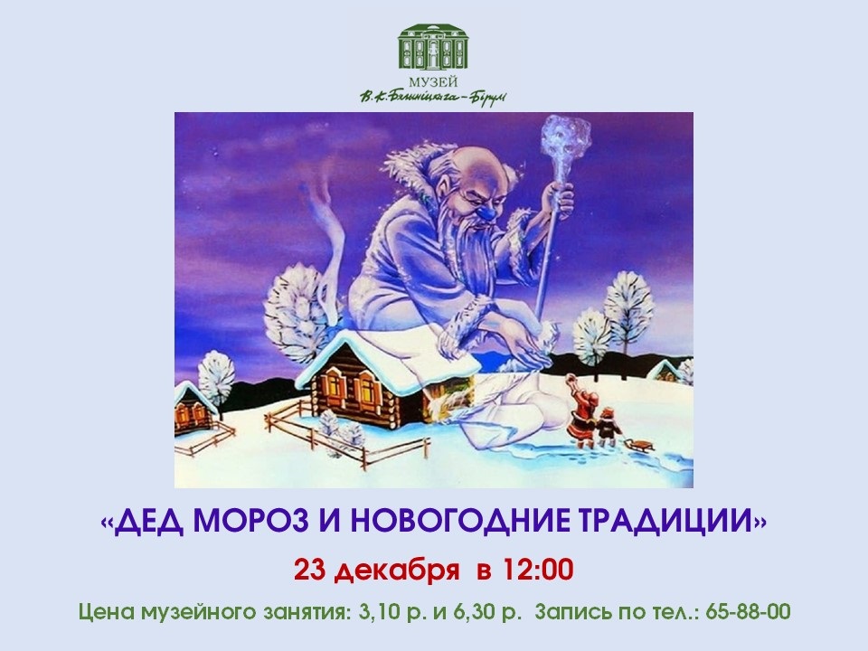 Музейное занятие с мультимедийной презентацией «Дед Мороз и новогодние традиции» пройдет 23 декабря в музее В.К.Бялыницкого-Бирули (ул.Ленинская, 37).