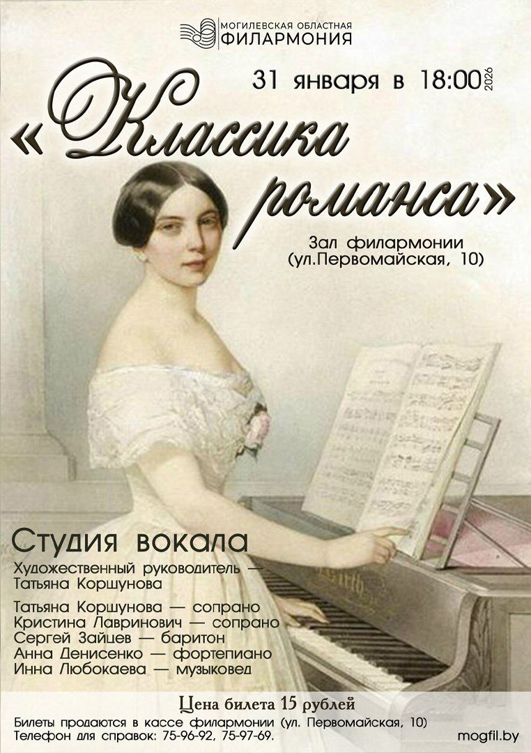 Концертную программу «Классика романса» представят 31 января в Могилеве солисты студии вокала областной филармонии (художественный руководитель Татьяна Коршунова).