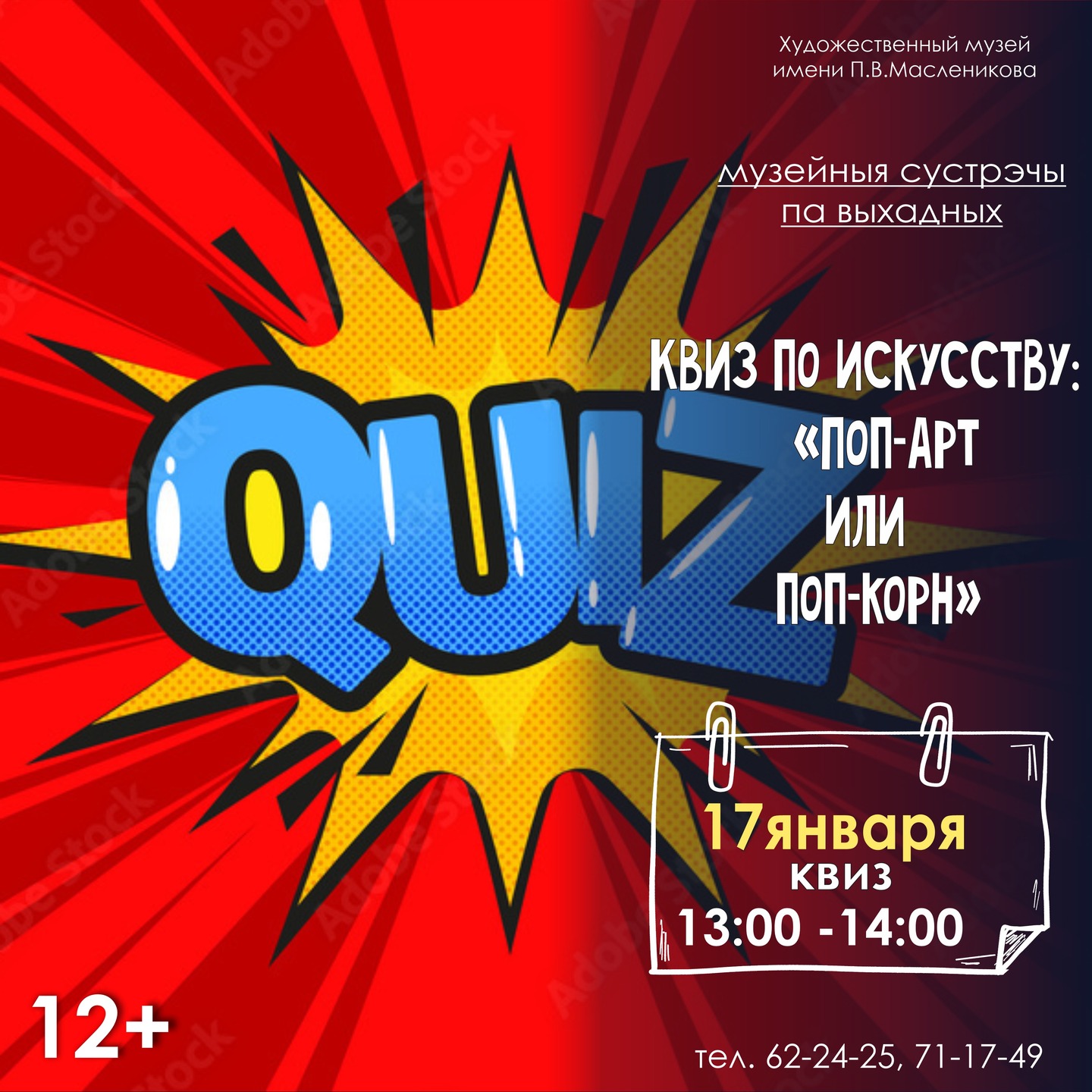 В субботу, 17 января, в учреждении культуры состоится музейное занятие «Квиз по искусству: Поп-арт или поп-корн». Во время мероприятия его участники смогут проверить свои знания в истории изобразительных искусств, открыть для себя новое из биографий известных художников, а также показать себя знатоками кинематографа. Начало в 13:00.
