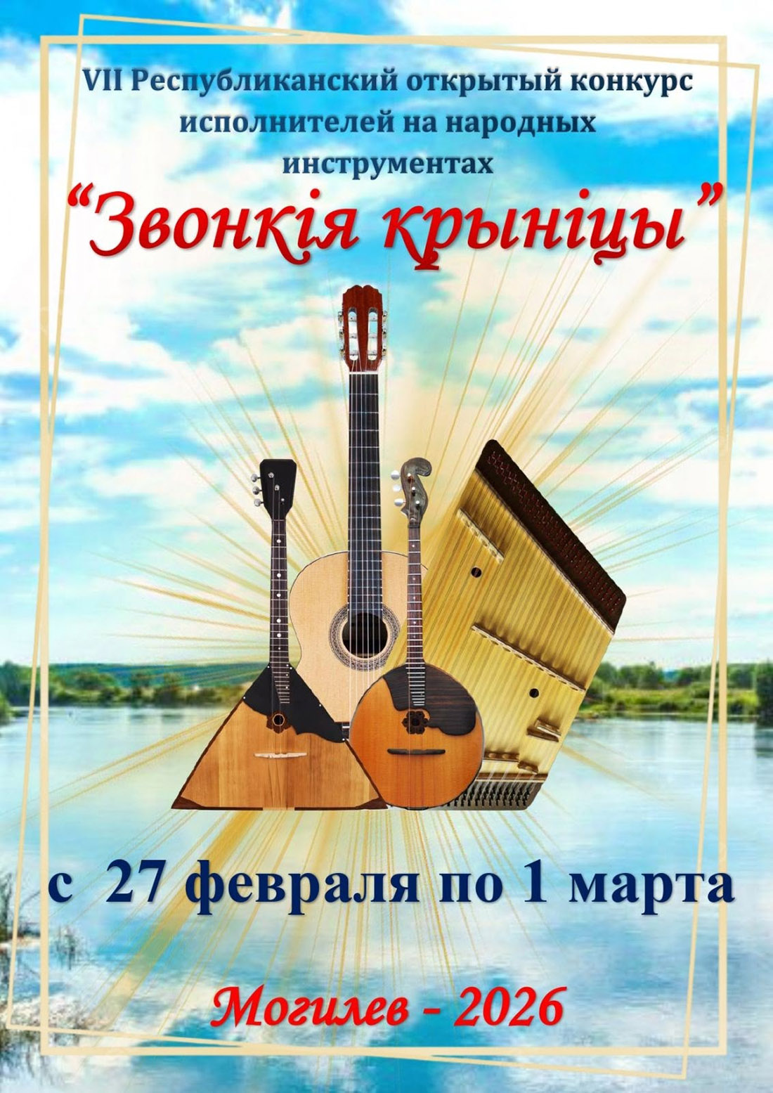 VII Республиканский открытый конкурс исполнителей на народных инструментах «Звонкія крыніцы» пройдет в областном центре. Творческое состязание будет организовано на базе Могилевской детской школы искусств № 3 им. М.Н.Солдатова с 27 февраля по 1 марта.