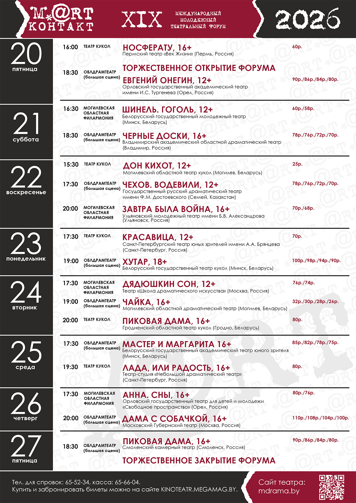 XIX Международный молодежный театральный форум «М.@rt.контакт» пройдет в Могилеве с 20 по 27 марта. Продажа билетов на мероприятия форума открыта с 29 января.