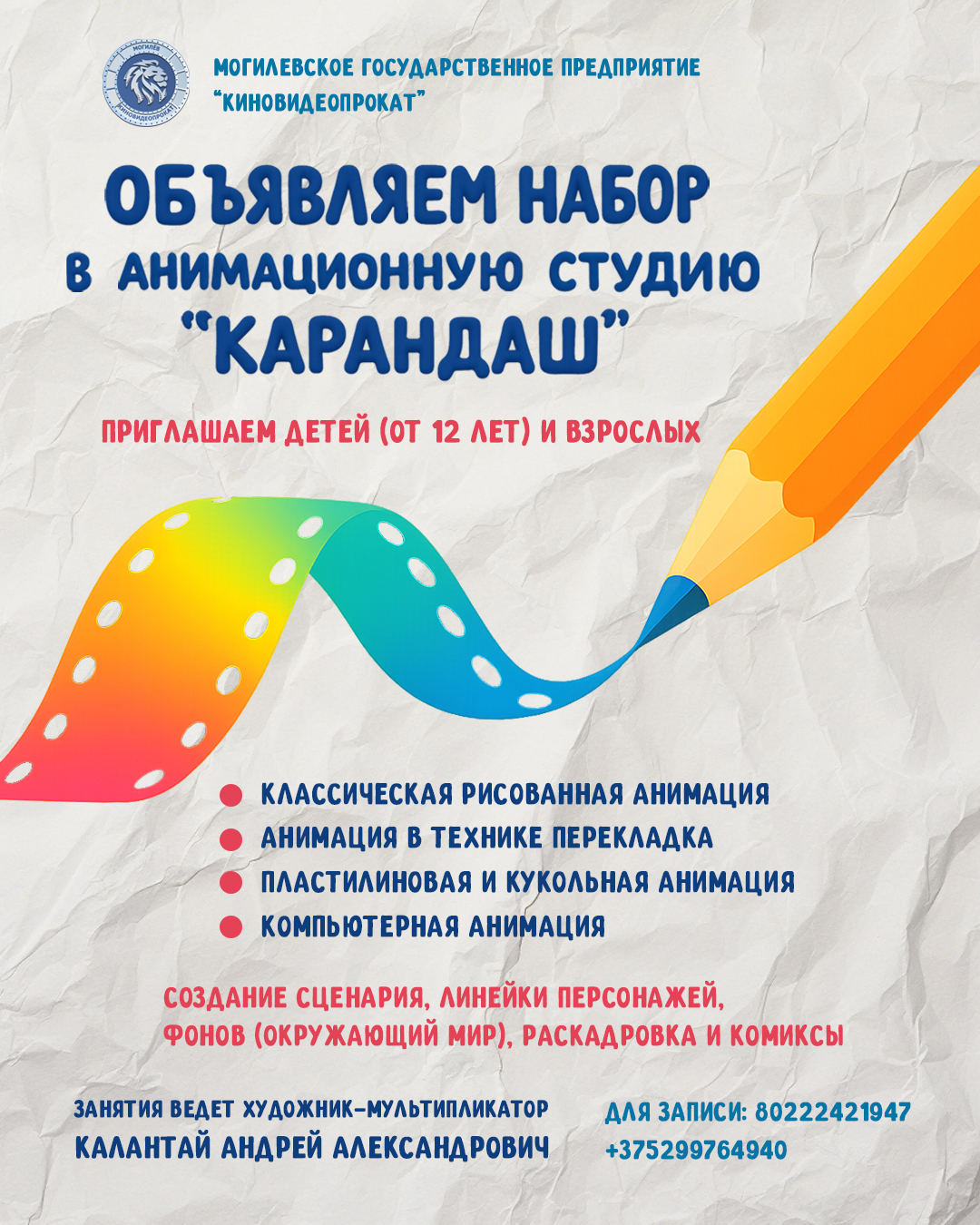 Могилевское государственное предприятие «Киновидеопрокат» приглашает детей в возрасте от 12 лет, а также взрослых в анимационную студию «Карандаш».