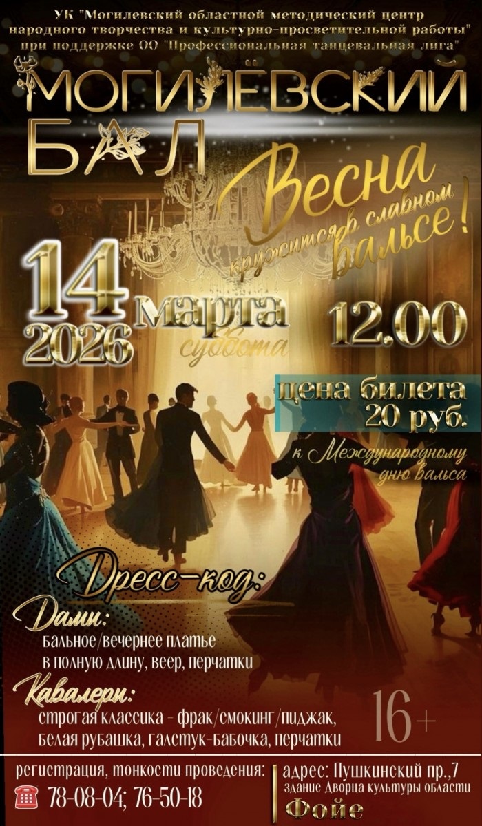 Бал начнется в 12:00 по адресу: г.Могилев, пр-т Пушкинский, 7 (здание ДК области). Регистрация участников — с 11:00 до 11:40. Возраст участников — от 16 лет. Стоимость билета — 20 рублей.