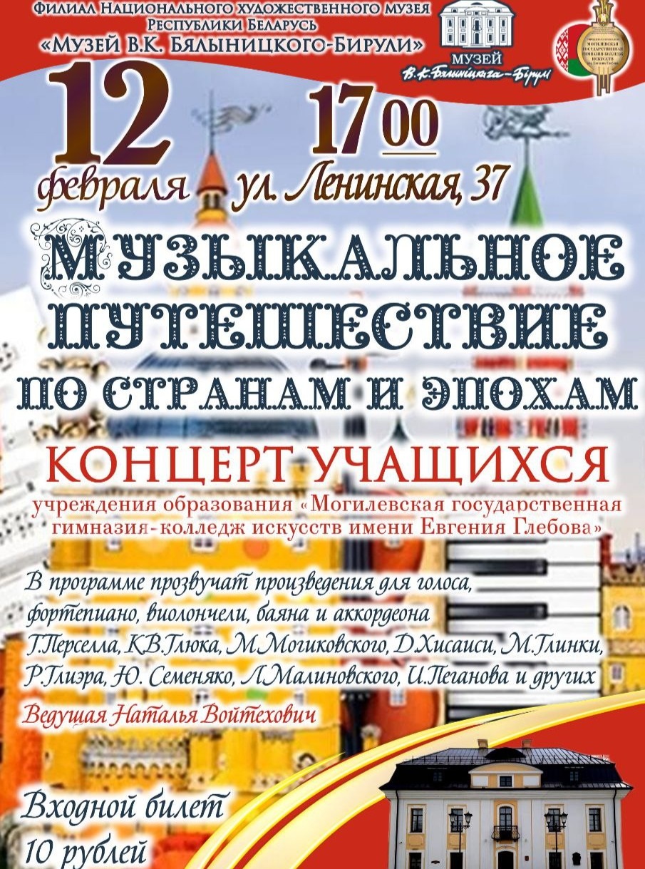 Концерт учащихся Могилевской государственной гимназии-колледжа искусств имени Евгения Глебова «Музыкальное путешествие по странам и эпохам» состоится в четверг, 12 февраля, в музее В.К.Бялыницкого-Бирули.
