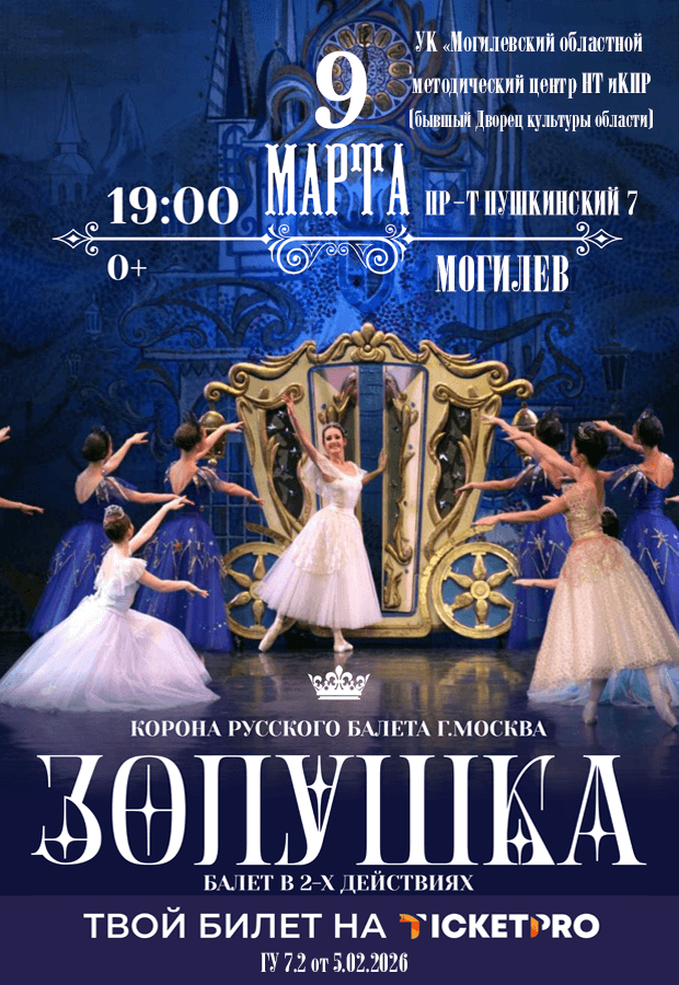 Московский театр «Корона Русского Балета» привезет в Могилев балет в 2-х действиях «Золушка». Постановка будет представлена 9 марта на сцене областного методического центра народного творчества и культурно-просветительной работы (пр-т Пушкинский, 7).