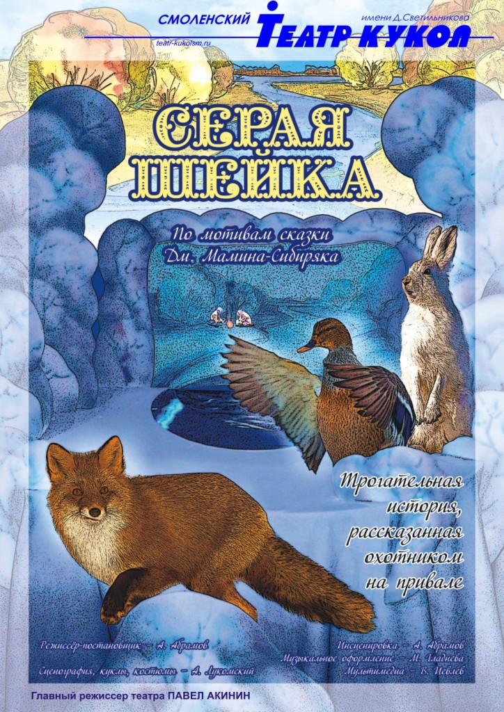 Так, Смоленский театр кукол привезет в Могилев спектакль «Серая шейка» – трогательную историю по мотивам классической сказки Д.Н.Мамина-Сибиряка о маленькой уточке со сломанным крылом, оставшейся зимовать в одиночестве. Над постановкой работает режиссер Андрей Абрамов. Продолжительность спектакля – 45 минут; рекомендуемый возраст – от 4-х лет.