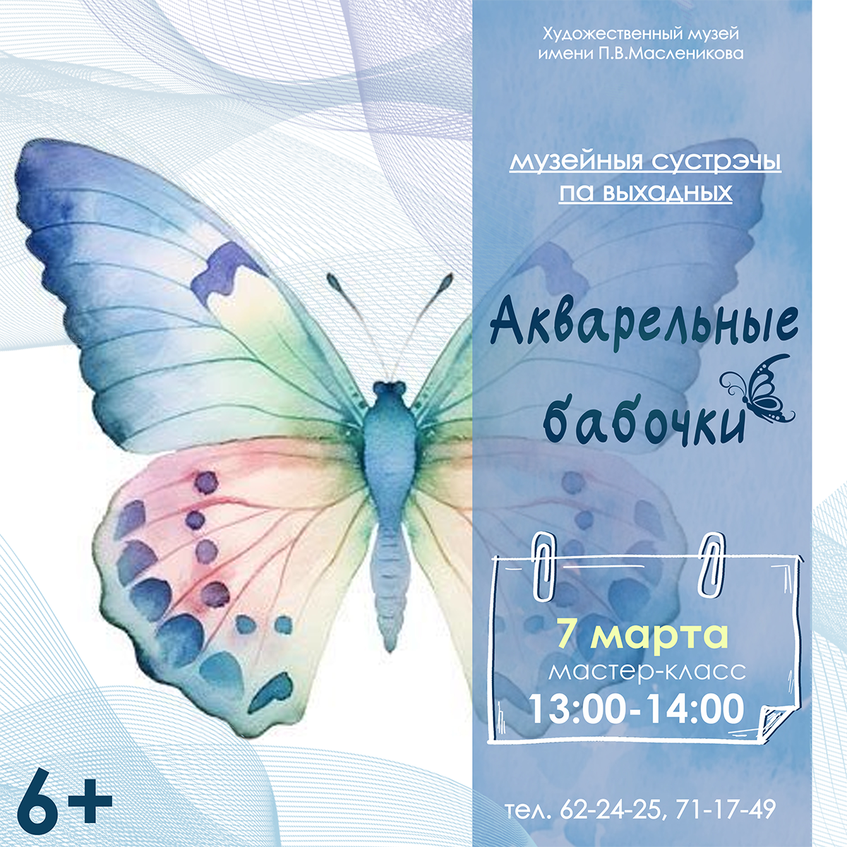 Так, в субботу, 7 марта, в музее состоится мастер-класс «Акварельные бабочки». Во время мероприятия участники смогут больше узнать о технике акварели, ее особенностях, а также своими руками создадут ярких акварельных бабочек. Начало мастер-класса в 13:00.