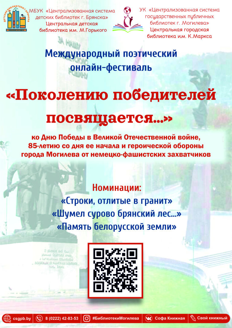 Могилевчан приглашают принять участие в международном поэтическом онлайн-фестивале «Поколению победителей посвящается…». Организаторами мероприятия выступают Центральная городская библиотека им. К.Маркса (г.Могилев) и Центральная детская библиотека им. М.Горького (г.Брянск).