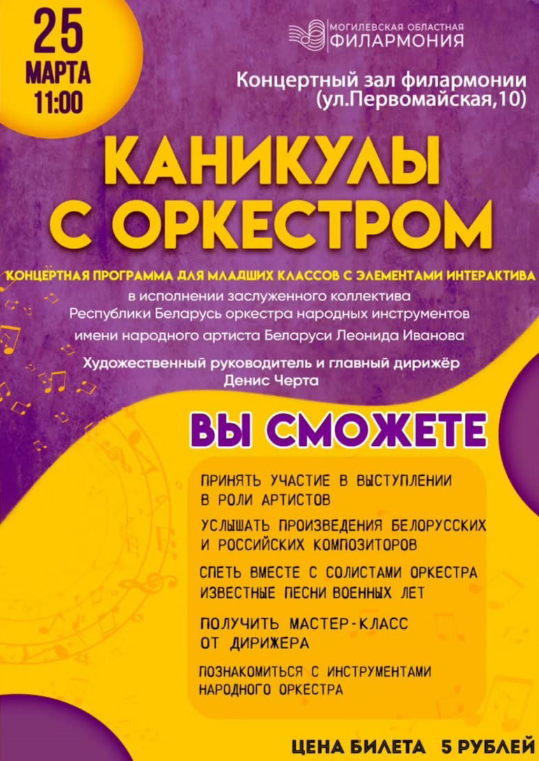 Концерт для младших классов с элементами интерактива «Каникулы с оркестром» готовит заслуженный коллектив Республики Беларусь оркестр народных инструментов имени народного артиста Беларуси Л.Л.Иванова (дирижер – Денис Черта). Программа будет представлена 25 марта в зале Могилевской областной филармонии (ул.Первомайская, 10).