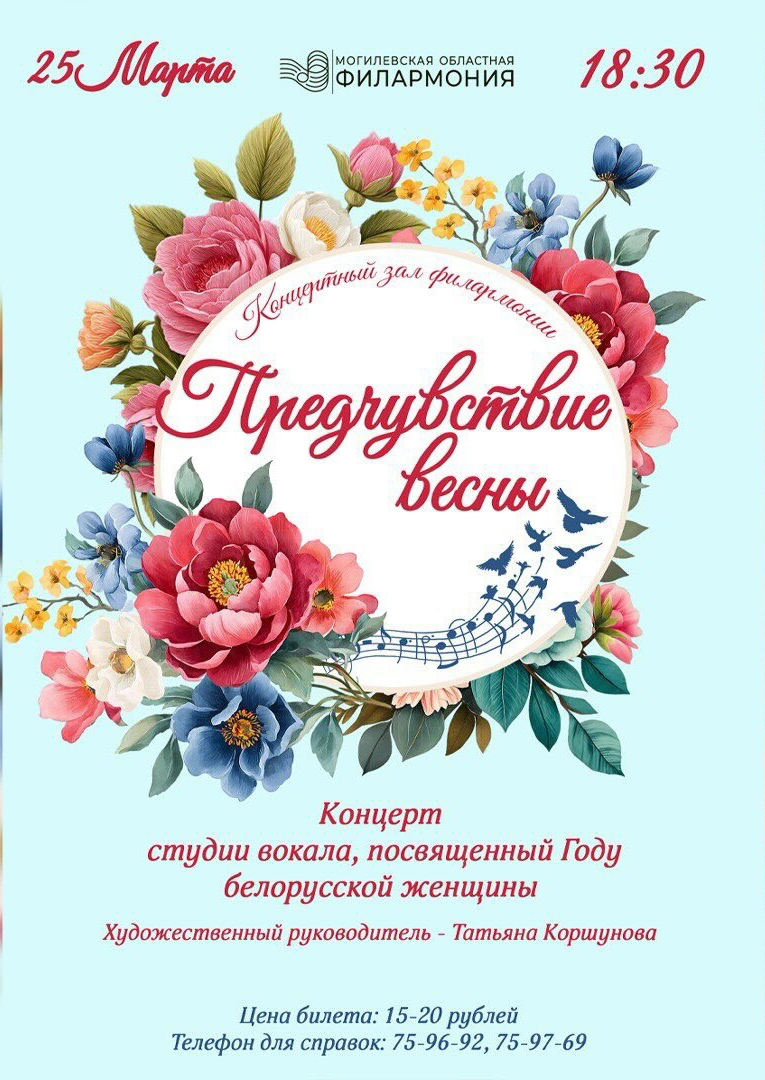 Концерт «Предчувствие весны», приуроченный к Году белорусской женщины, состоится 25 марта в Могилевской областной филармонии (ул.Первомайская, 10).
