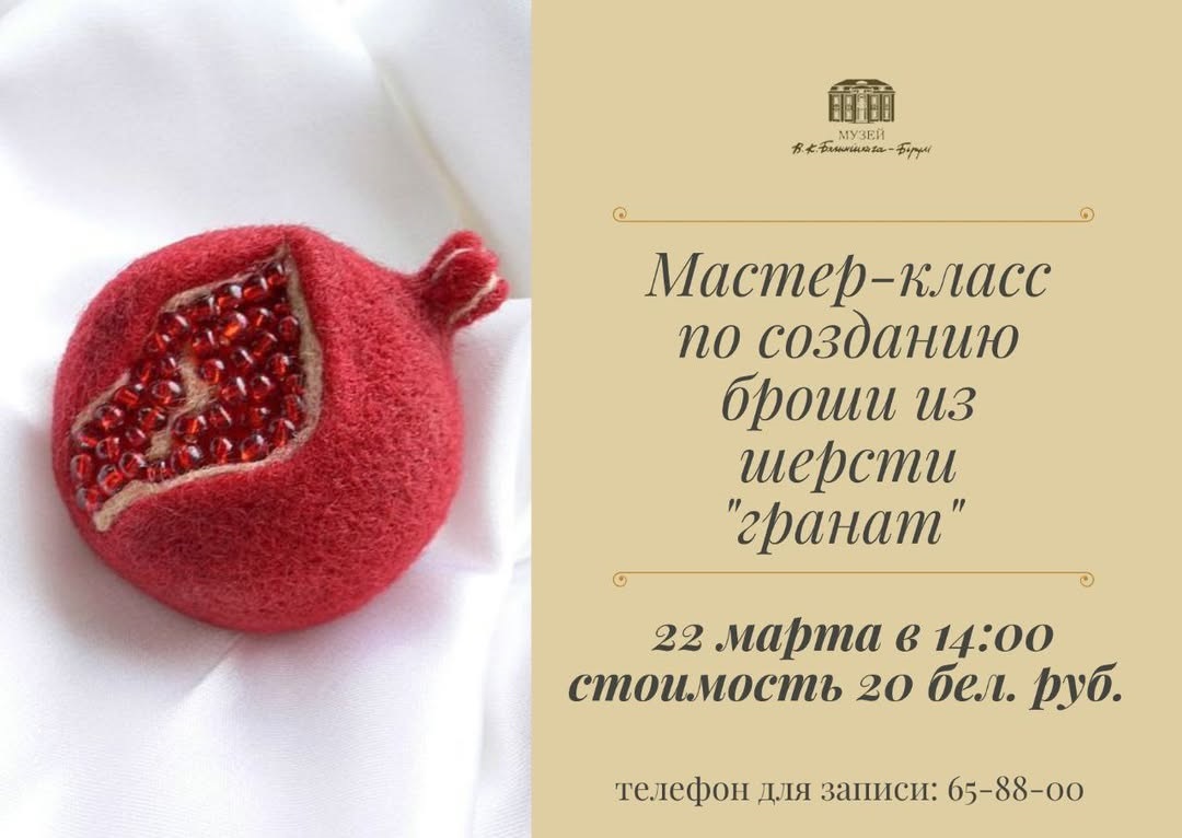 Мастер-класс по созданию броши из шерсти «Гранат» состоится в воскресенье, 22 марта, в музее В.К.Бялыницкого-Бирули (ул.Ленинская, 37).