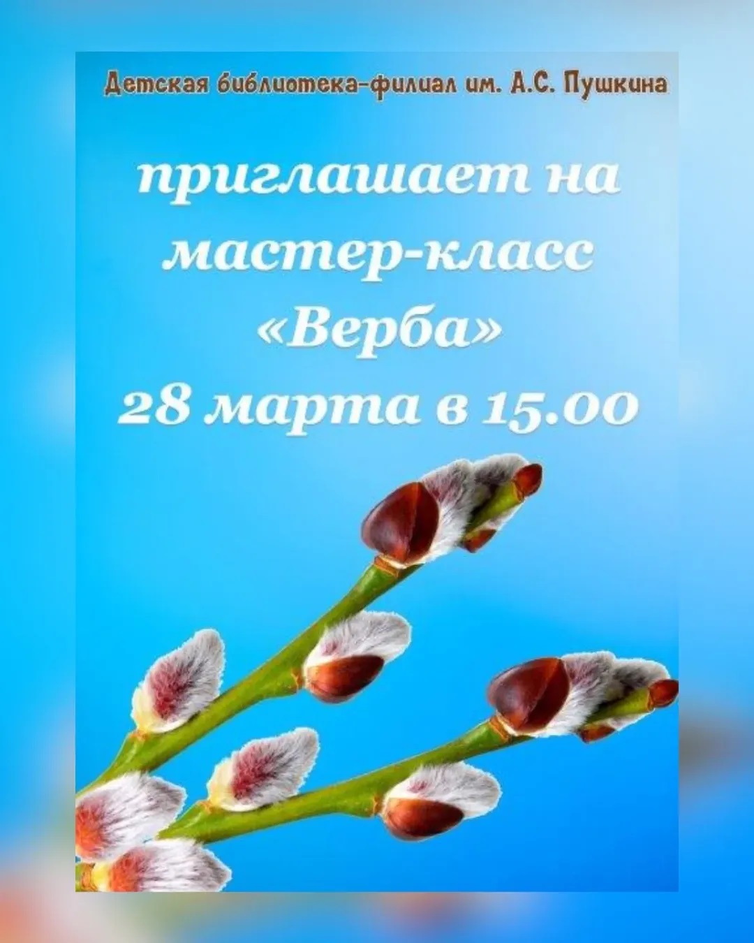 Мастер-класс «Верба» состоится в субботу, 28 марта, в детской библиотеке-филиале им. А.С.Пушкина (пр-т Пушкинский, 36).