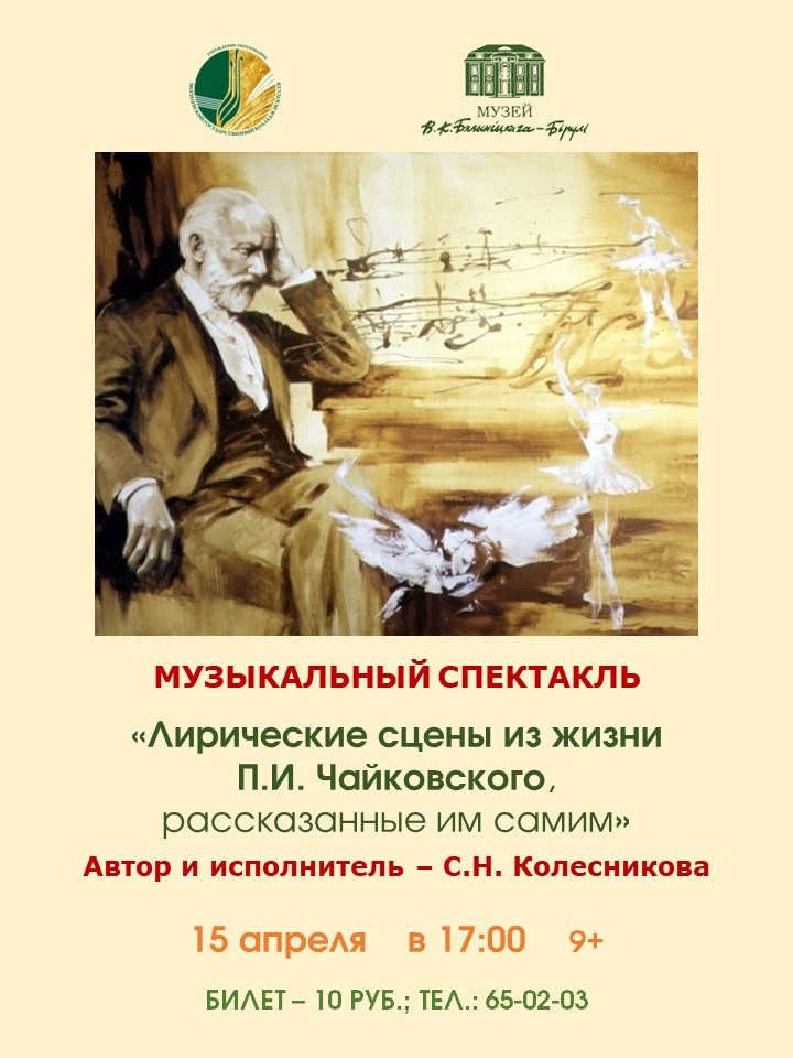 Музыкальный спектакль «Лирические сцены из жизни П.И. Чайковского, рассказанные им самим» состоится 15 апреля в музее В.К.Бялыницкого-Бирули (ул.Ленинская, 37).