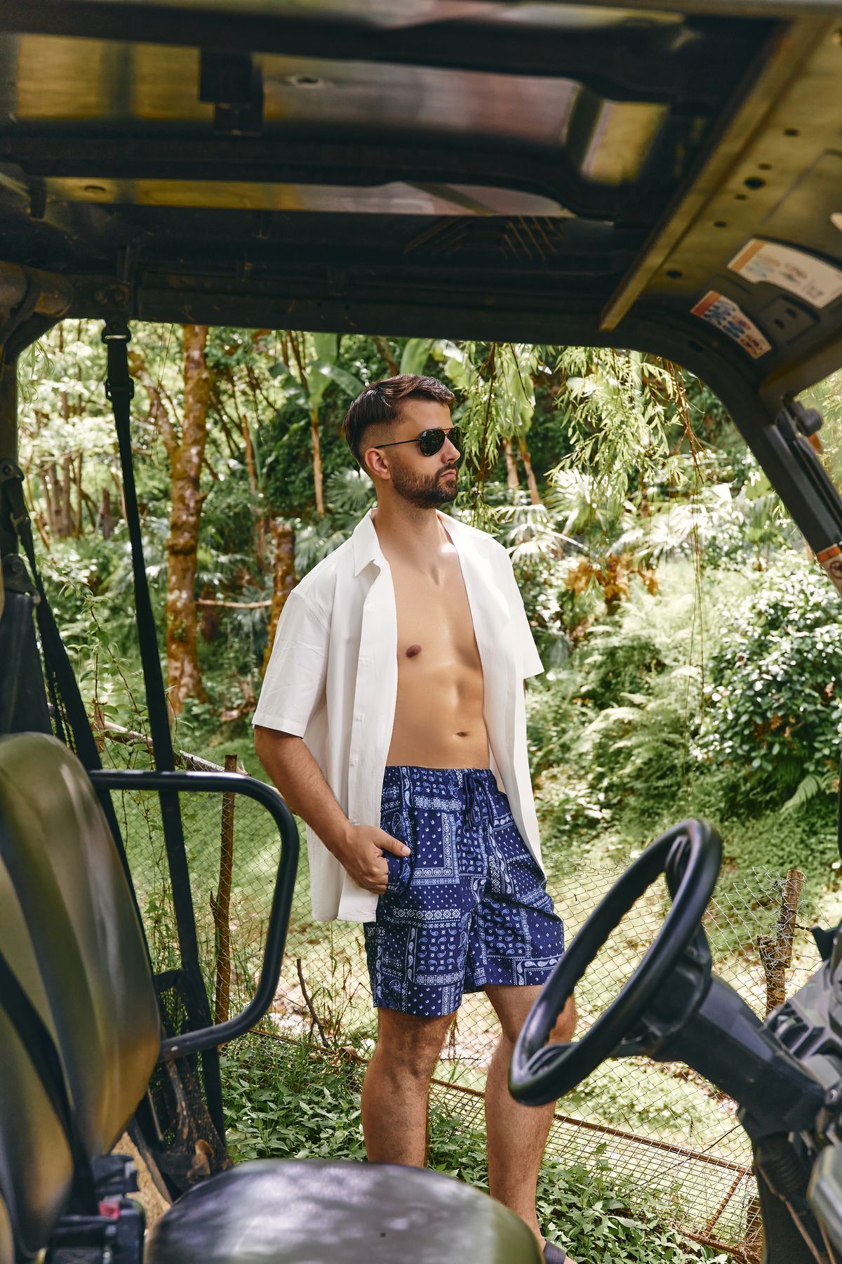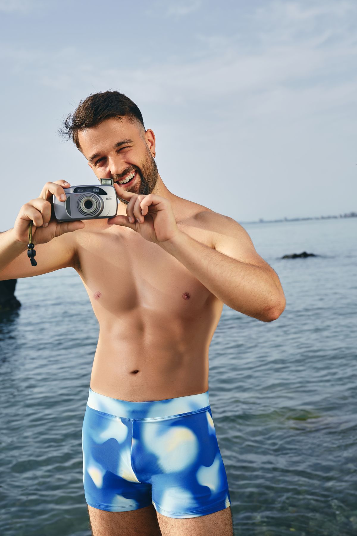 Мужская линейка включает как классические плавки-боксеры и слипы, так и удлиненные шорты. Особенно выделяются модели с летними принтами — пальмами, абстрактными узорами и тропическими мотивами. Цвета варьируются от базовых до насыщенных — красного, синего и аквамарин.