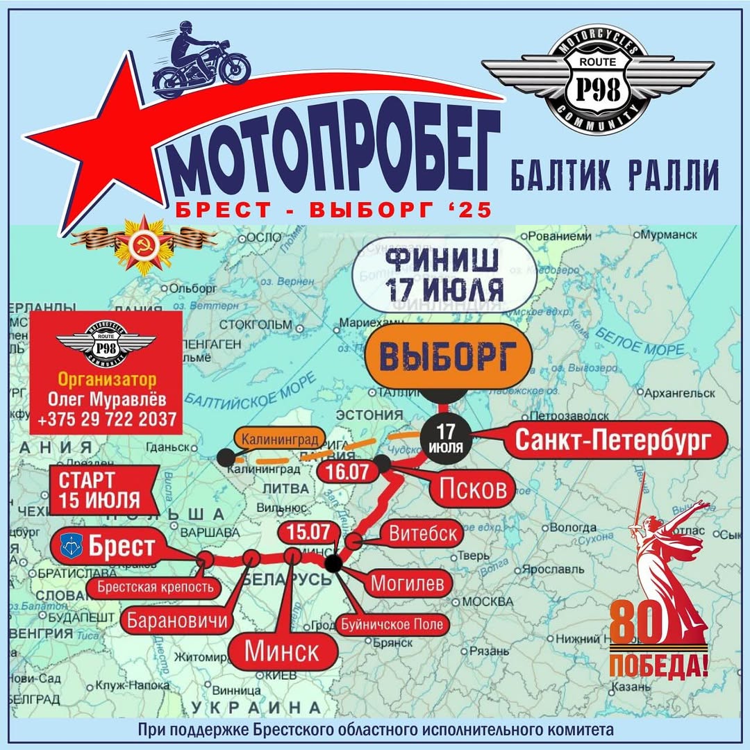 Могилев 15 июля примет участников мотопробега Брест-Выборг, посвященного 80-летию Победы в Великой Отечественной войне.