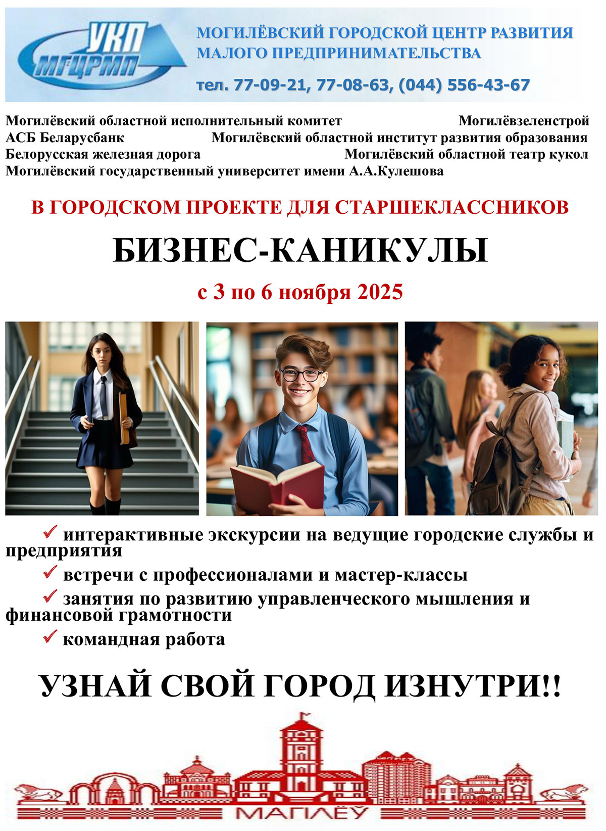 Городской проект для старшеклассников «Бизнес-каникулы» будет организован в Могилеве с 3 по 6 ноября. Об этом сообщили в Центре развития малого предпринимательства.