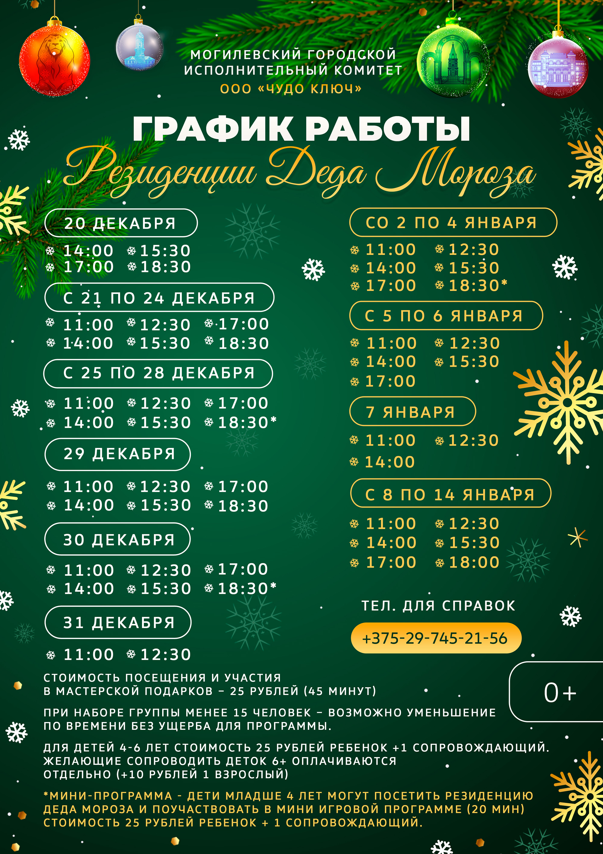 В отдельные дни дети младше 4-х лет могут посетить резиденцию Деда Мороза и поучаствовать в мини-игровой программе (20 минут). Стоимость 25 рублей (ребенок и один сопровождающий).