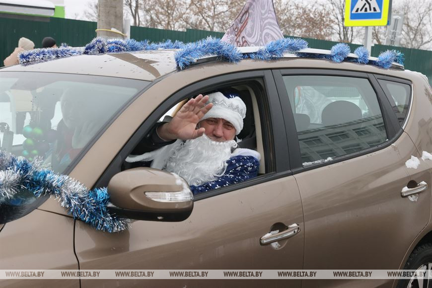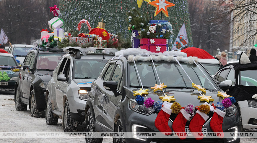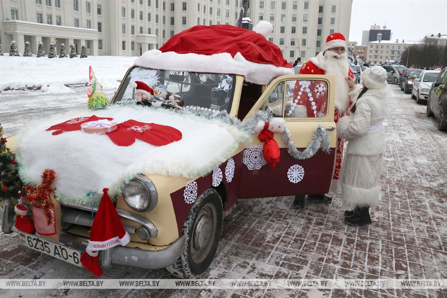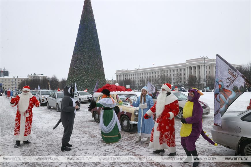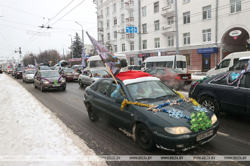 Яркий костюмированный новогодний автопарад "За рулем Дед Мороз" прошел в Могилеве. По центру города проехали более 70 украшенных автомобилей со сказочными персонажами и новогодними флагами.