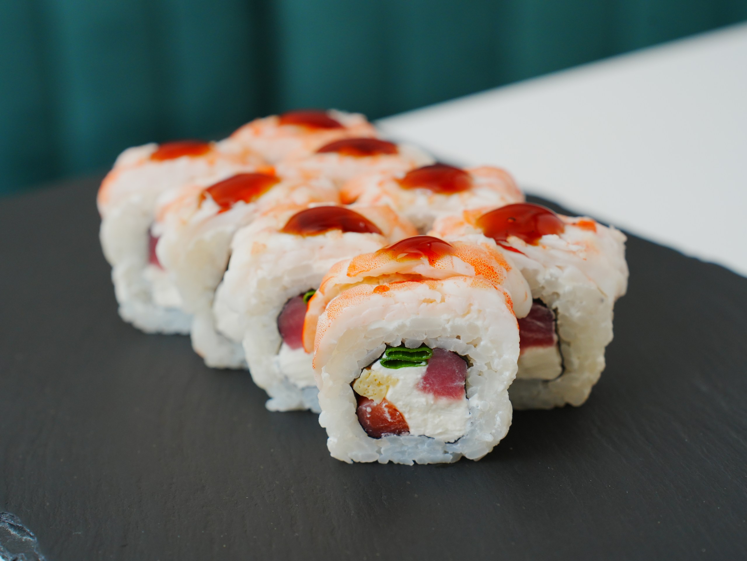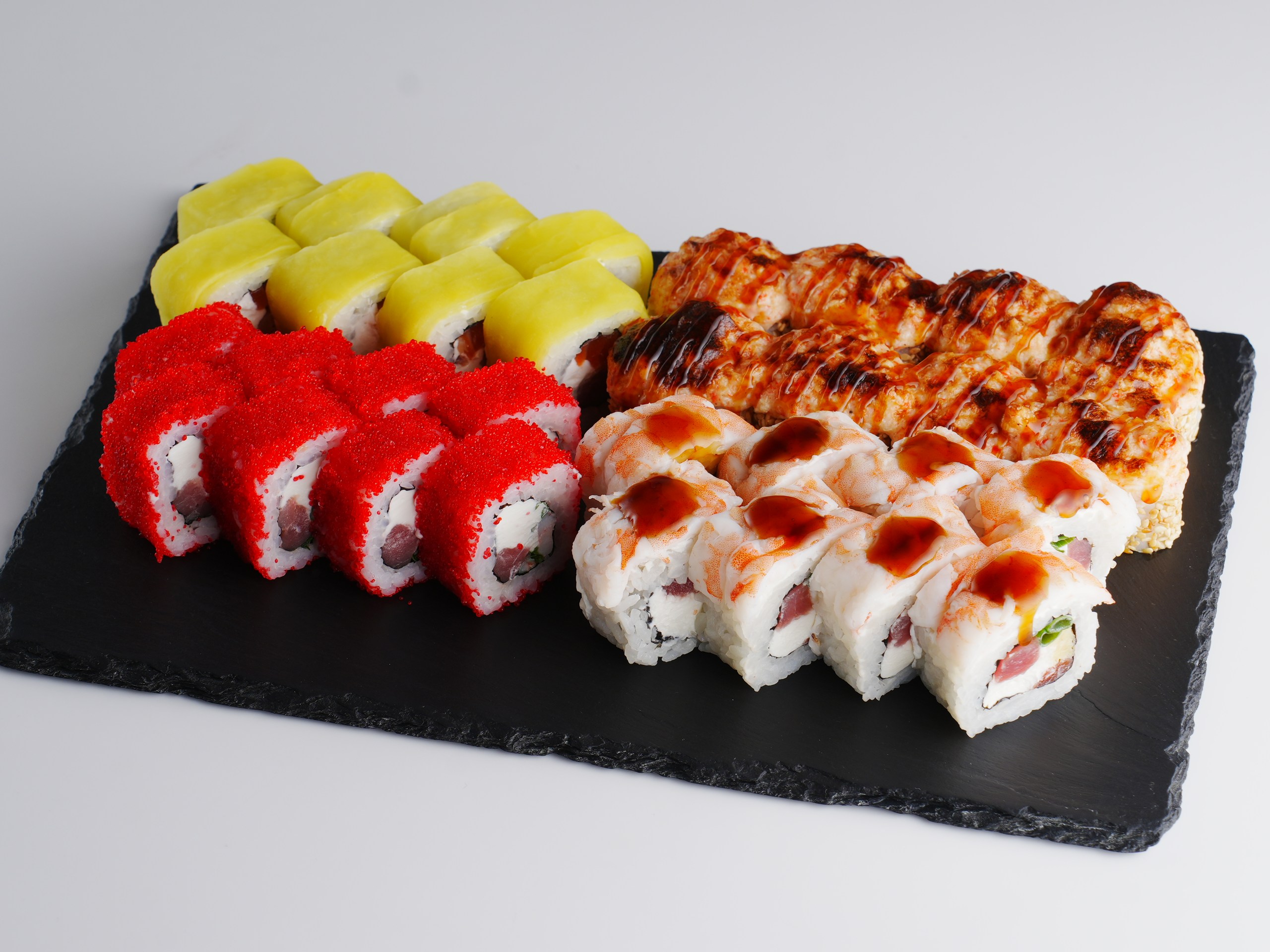 Столько же стоят роллы «Тигровый гранд», которые готовят из тунца, лосося и тигровой креветки. В дополнение идут омлет «томаго», зелёный лук и соус «Унаги». Порция добротная — 290 грамм.