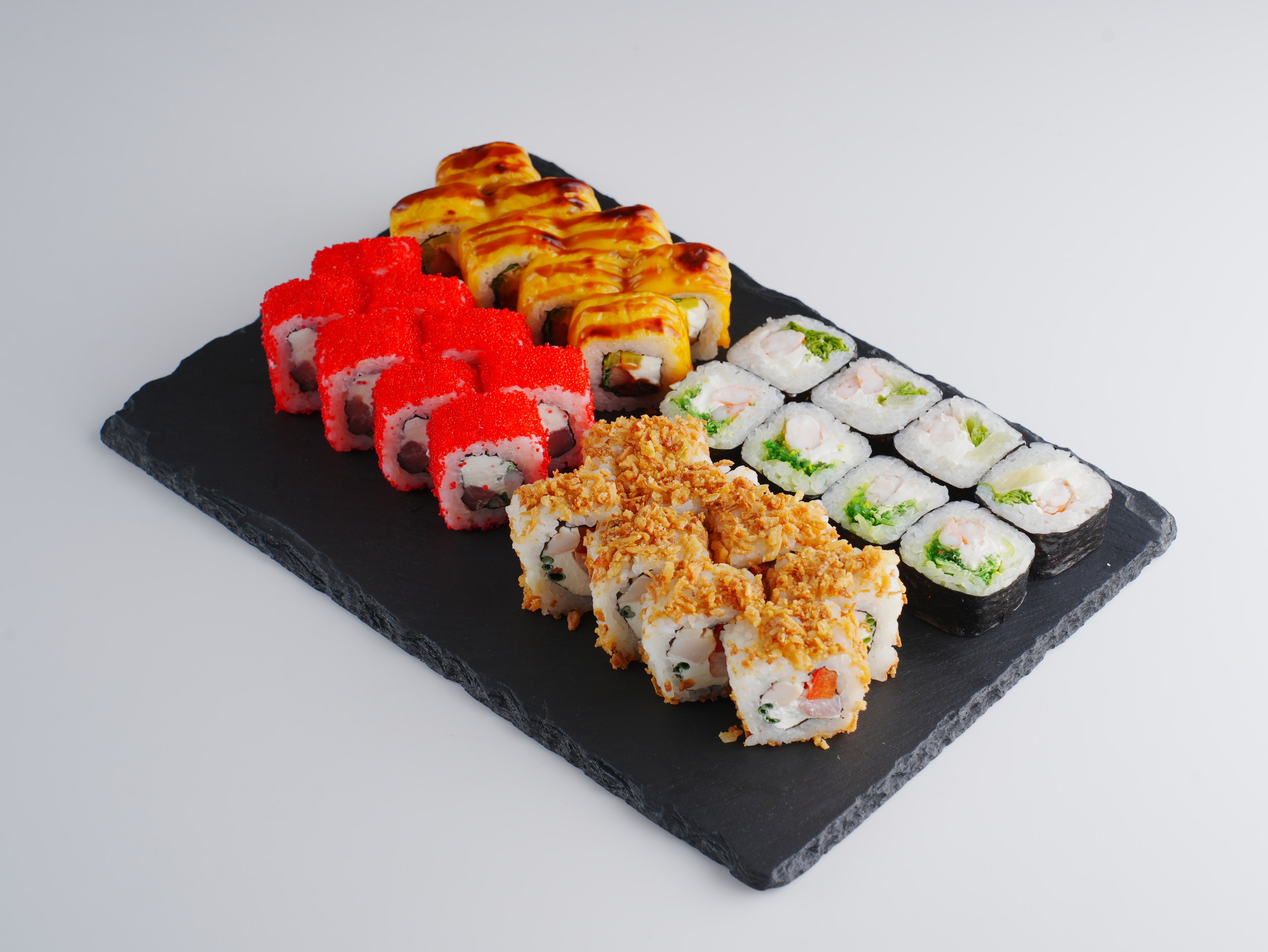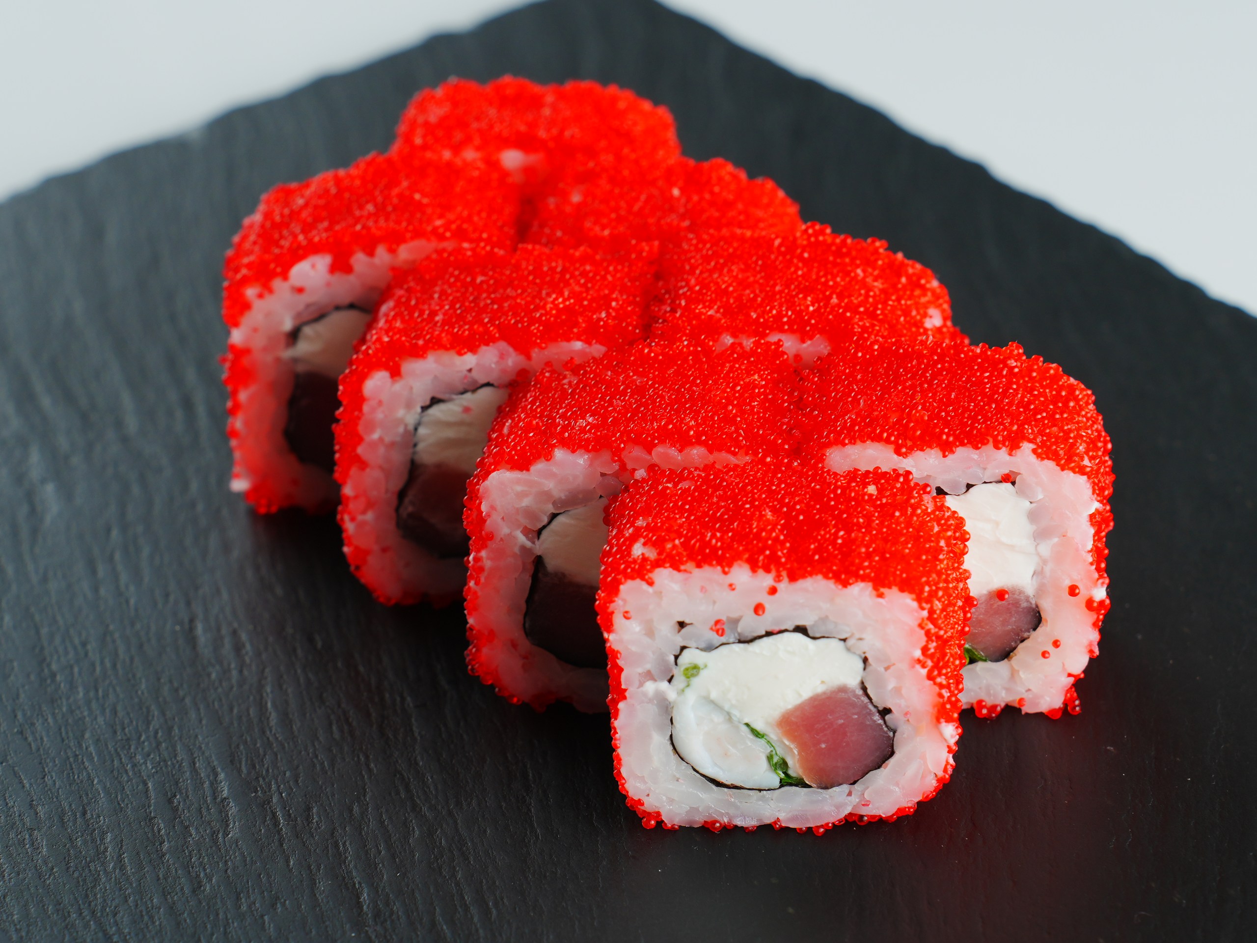Интересное морское сочетание у роллов «Три океана»: лосось, тунец, масляная рыба, такуан. Четыре ролла стоят 8,5 рубля, а полноценная порция в 270 грамм — 16,5. Интересен и «Фреш», в составе которого — тигровая креветка, тунец и икра летучей рыбы, приправленные рукколой. При весе в 245 грамм порция стоит 16 рублей, а вдвое меньше — 8,5.
