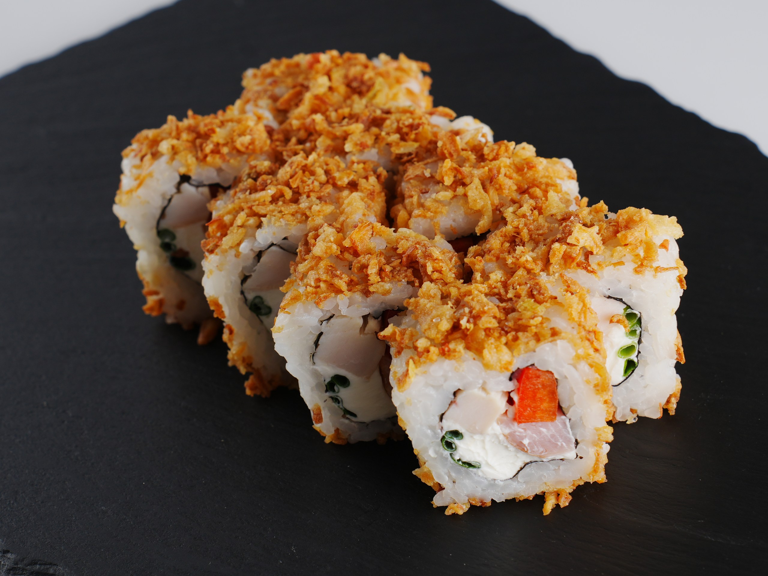 Еще один неординарный вариант суши — «Чикен Кранч». В них — бекон, копчёная курица, свежий перец, зелёный лук и лук фри. Порции хватит на ужин — 255 грамм. Цена за четыре ролла — 7,5 рубля, а за восемь — 14,5.