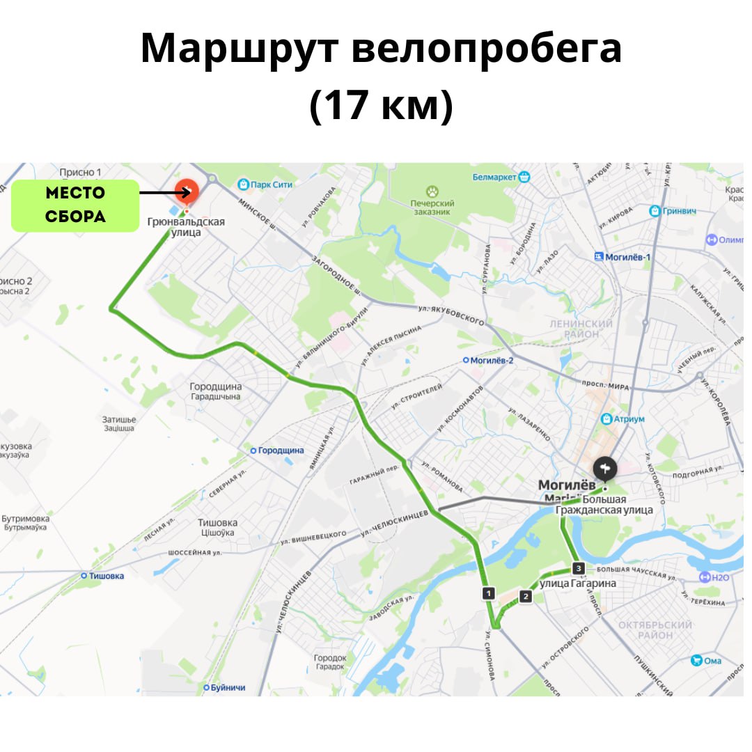 Старт велопробегу будет дан в 10:00 с улицы Грюнвальдской, далее колонна проследует по маршруту: проспект 17 Сентября — улица Космонавтов — проспект Шмидта, улица Гагарина — Пушкинский проспект, улица Большая Гражданская — парк в Подниколье.