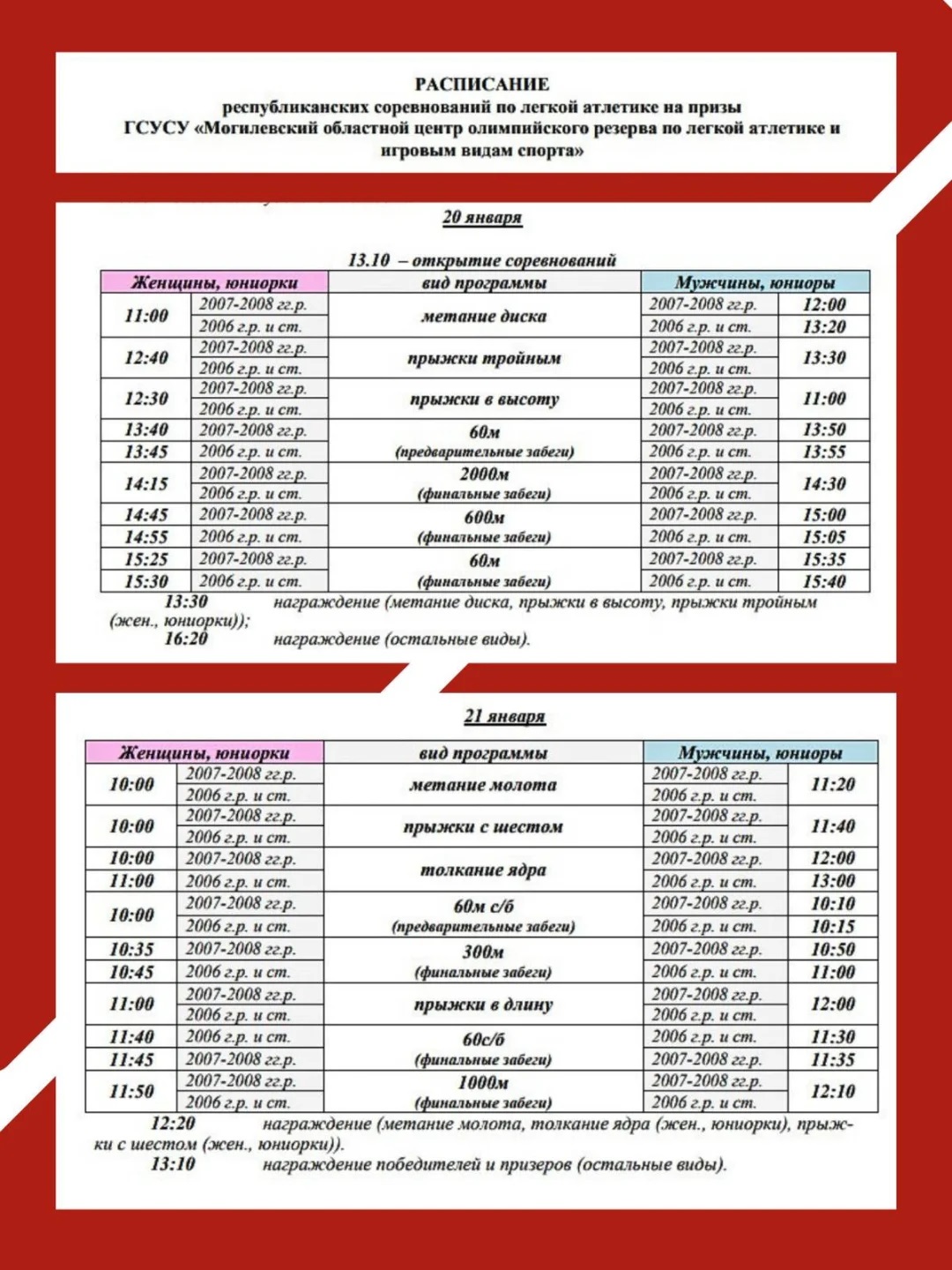 Открытые республиканские соревнования по легкой атлетике на призы Могилевского областного центра олимпийского резерва по легкой атлетике и игровым видам спорта пройдут в легкоатлетическом манеже СК «Олимпиец» 20-21 января.