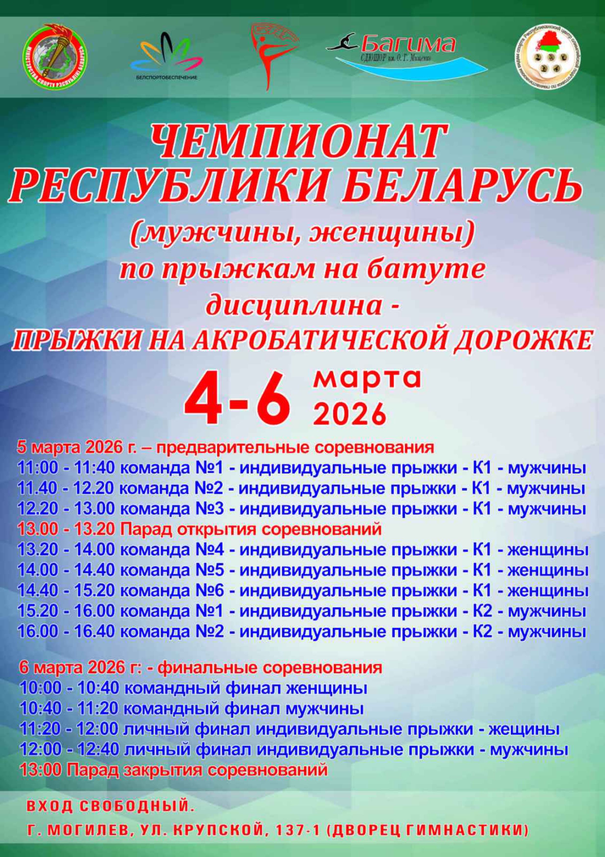 На базе Могилевской городской СДЮШОР «Багима» имени О.Г. Мищенко с 4 по 6 марта пройдет чемпионат Республики Беларусь по прыжкам на батуте (дисциплина – прыжки на акробатической дорожке).