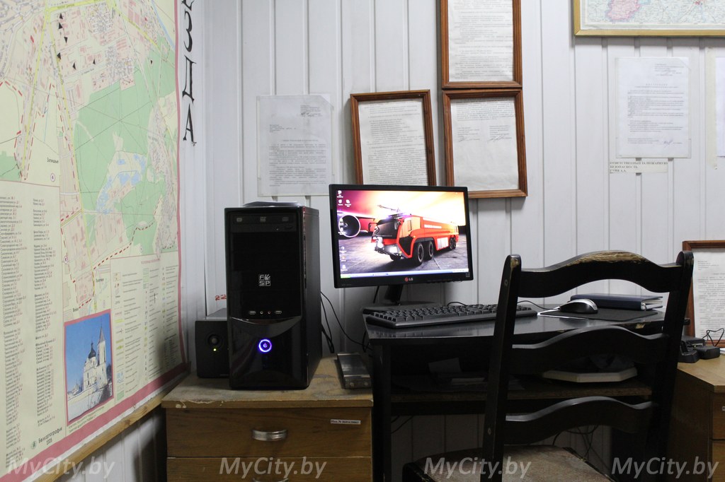 После осмотра этой части части (каламбур!), отправляемся дальше. Нас встречает отдельная комната — с рацией, «красным» телефоном и картой района. «Звонки о происшествиях поступают к нам или на прямой телефон, или по рации, — продолжает экскурсию Евгений Геннадьевич. — Позывной нашей части — „Троица“. Благодаря системе „Феникс“, на экран компьютера приходит „путёвка“ — информация, куда ехать, что там происходит, сколько техники туда уже отправилось на выезд».