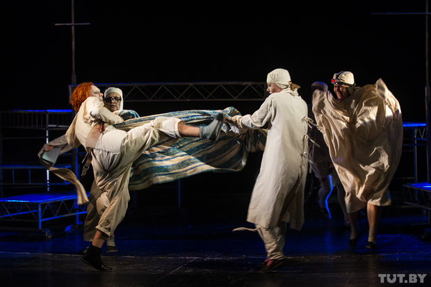Роли в спектакле играют: Евгения Белоцерковская, Елена Кривонос, Анна Кушнер, Наталья Колокустова, Ирина Дунченко, Екатерина Кондолева, Ольга Носулько и Дмитрий Дудкевич. Режиссёр решил избавиться от нагромождения реквизита, поэтому на сцене — лишь актеры и декорации-скелеты.