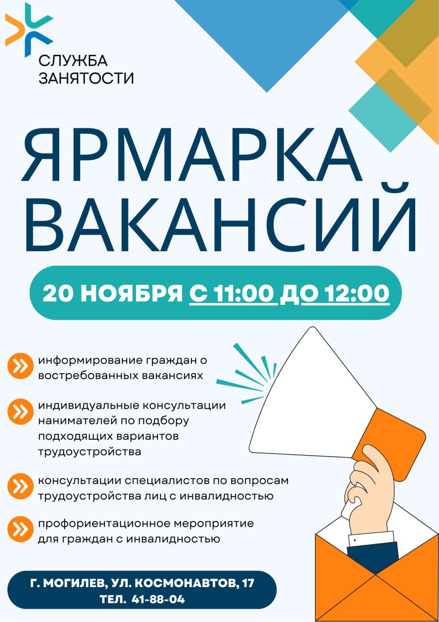 Ярмарка вакансий пройдет в Могилеве 20 ноября (четверг). Мероприятие будет организовано с 11:00 до 12:00 по адресу: ул.Космонавтов, 17 (управление по труду, занятости и социальной защите горисполкома).