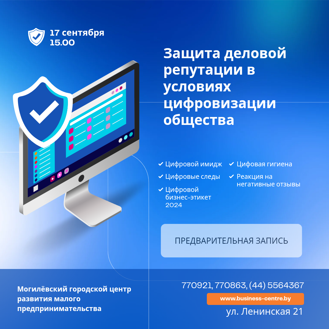 Могилевский городской центр развития малого предпринимательства проведет семинар на тему «Защита деловой репутации в условиях цифровизации общества». К участию приглашаются представители бизнеса, трудовых коллективов, заинтересованные граждане.