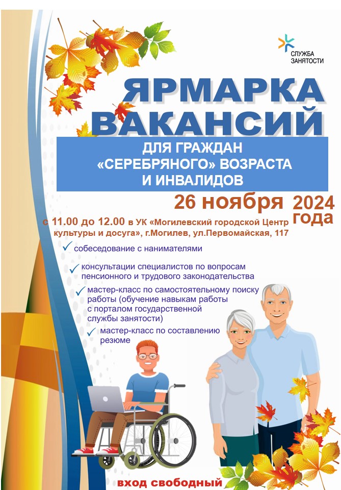 Республиканская ярмарка вакансий для граждан предпенсионного и пенсионного возраста, а также инвалидов состоится в Могилеве 26 ноября.