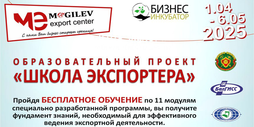 С 1 апреля по 6 мая в Центре экспорта Могилевской области, который функционирует на базе Могилевского агентства регионального развития, стартует образовательный проект «Школа экспортера». Участие в проекте предусматривает бесплатное обучение основам экспортной деятельности для представителей предпринимательства, организаций и предприятий.