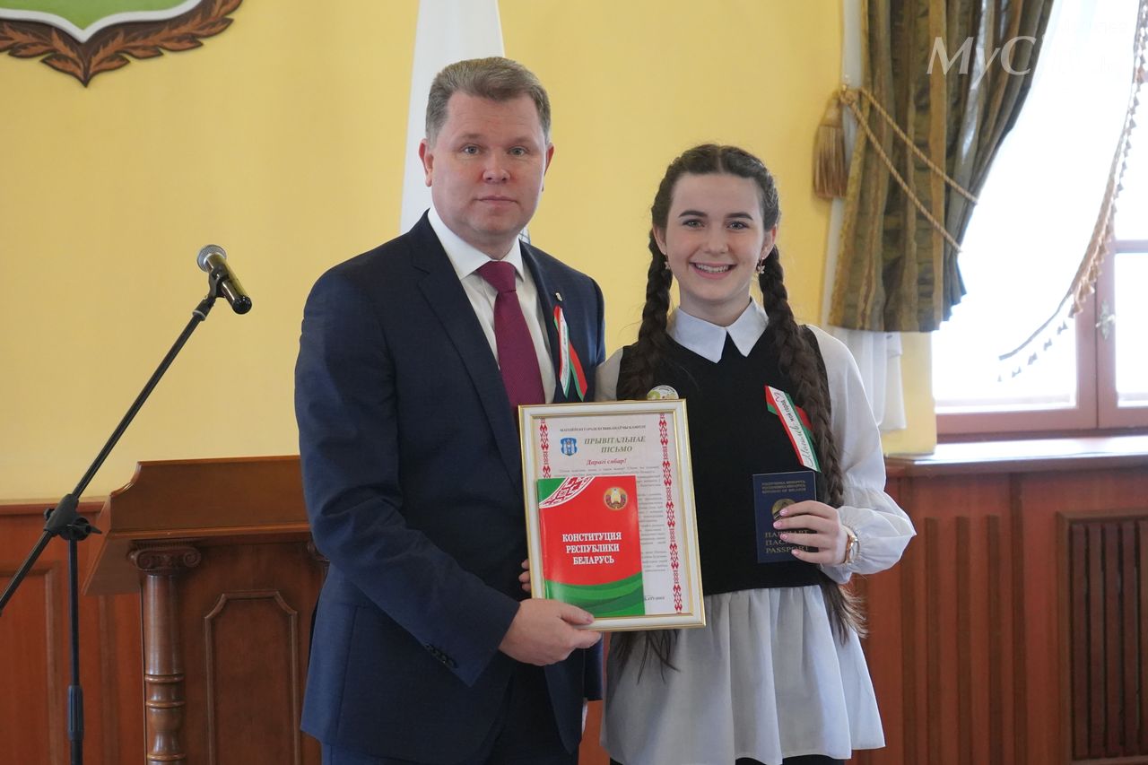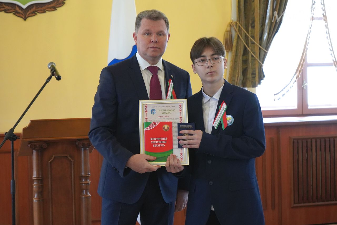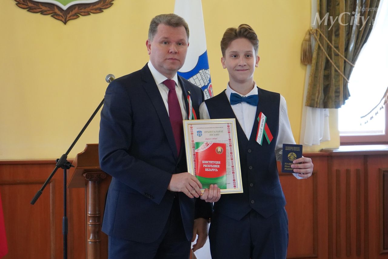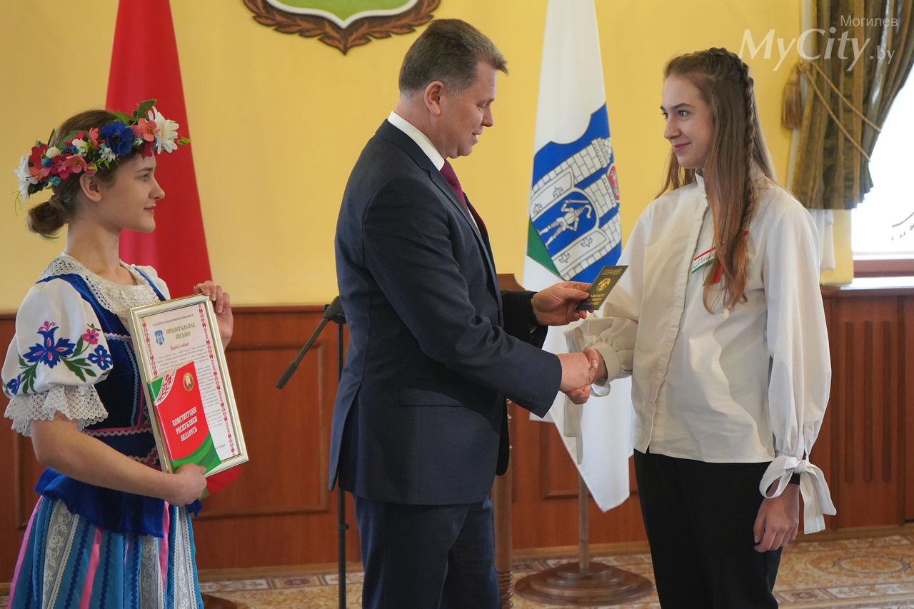 Юные могилевчане — отличники учебы, победители и призеры различных соревнований, предметных олимпиад и творческих конкурсов — получили важный в жизни каждого белоруса документ, паспорт гражданина Республики Беларусь, из рук председателя Могилевского горисполкома Александра Студнева.