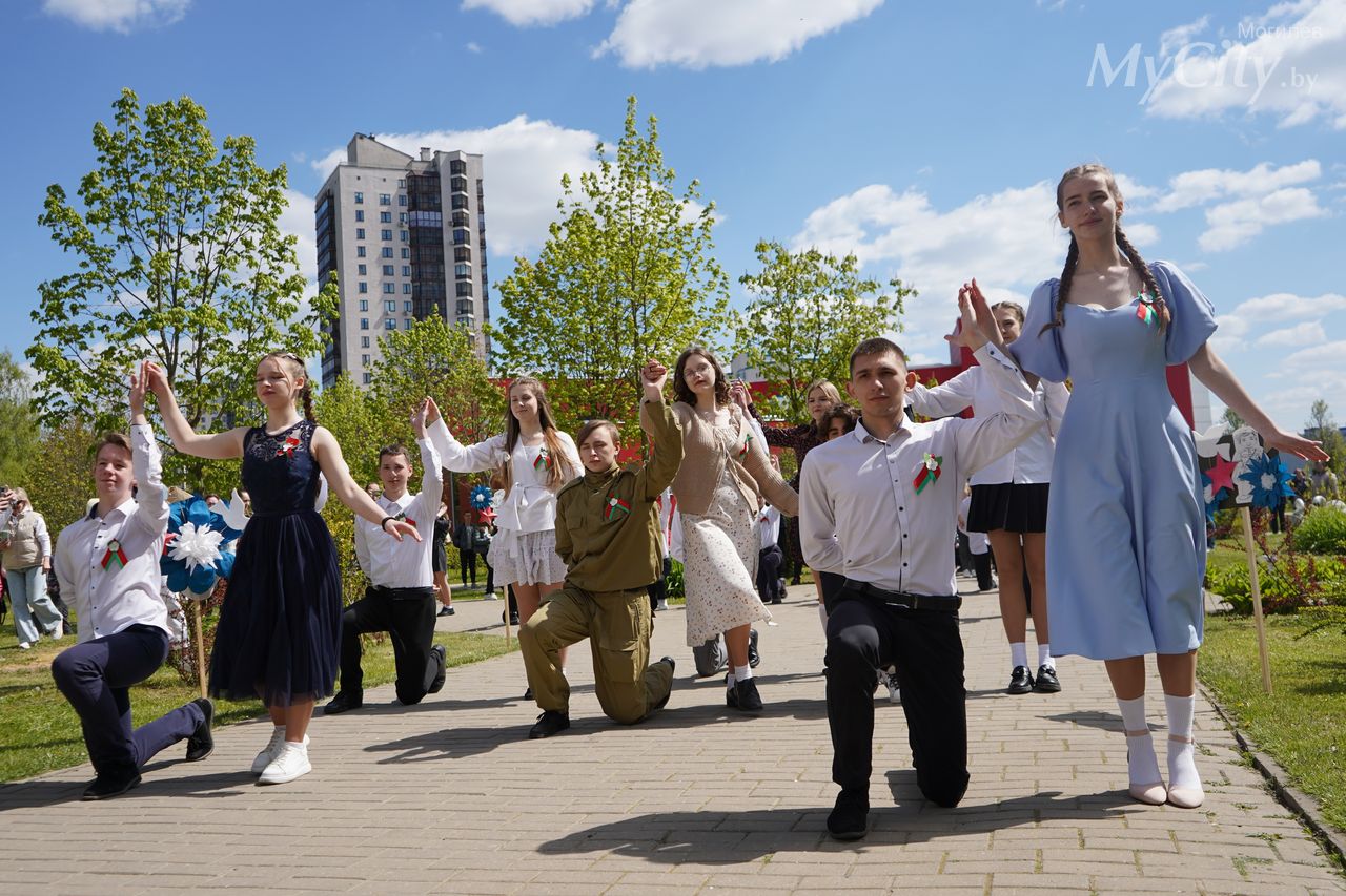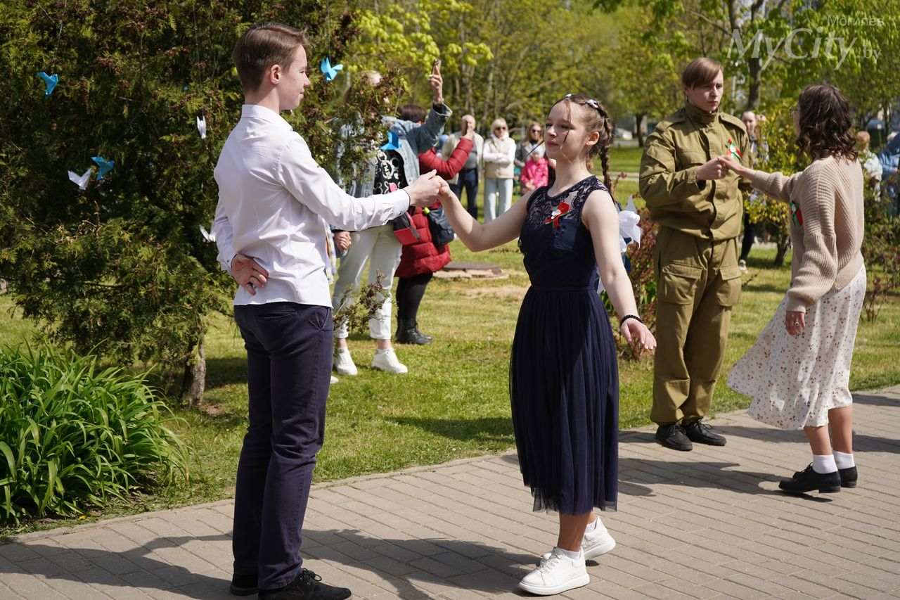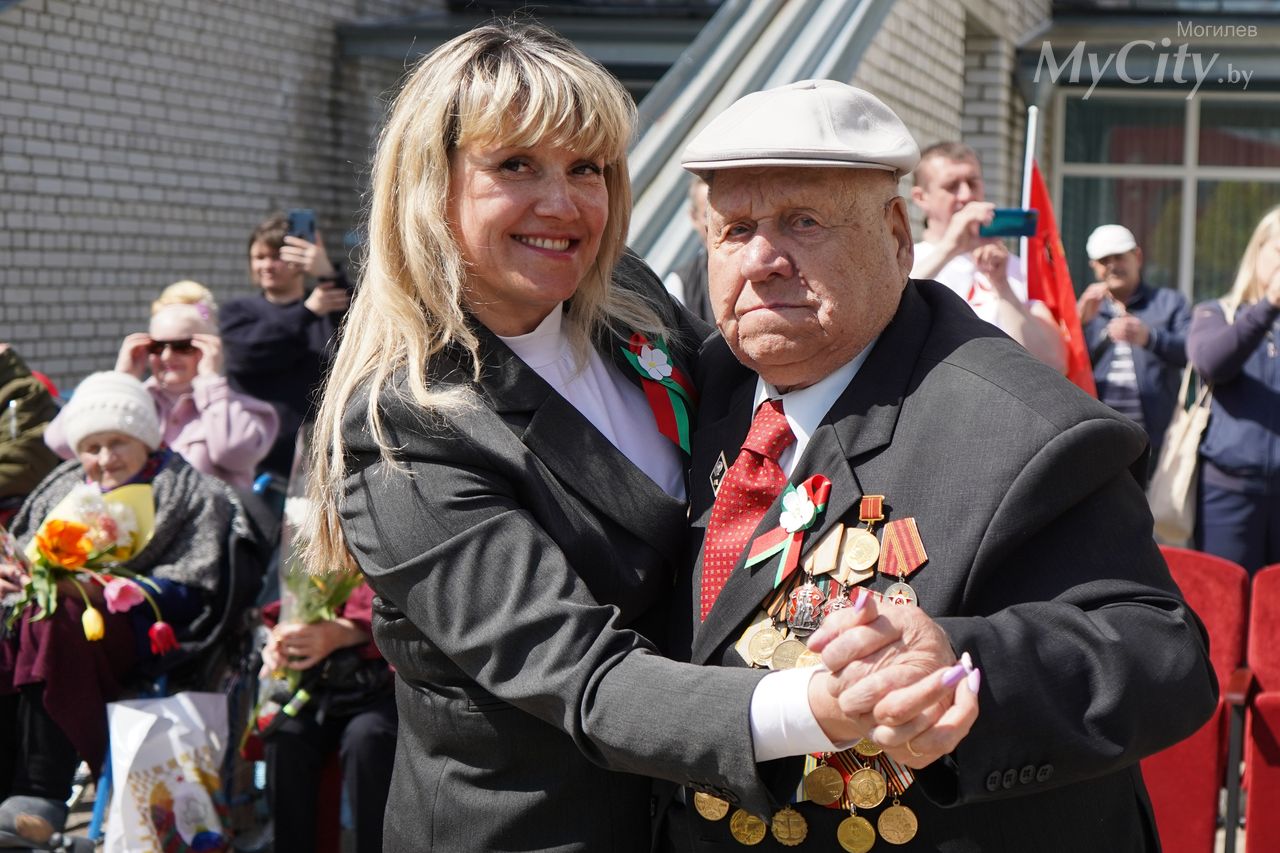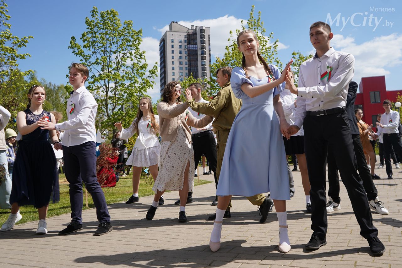 В Могилеве 13 пар из разных школ города станцевали «Победный вальс». Молодежным флешмобом ребята поздравили ветерана Великой Отечественной войны Федора Ивановича Кривоногова, бывших узников концлагерей, которые проживают в доме ветеранов, с Днем Победы.