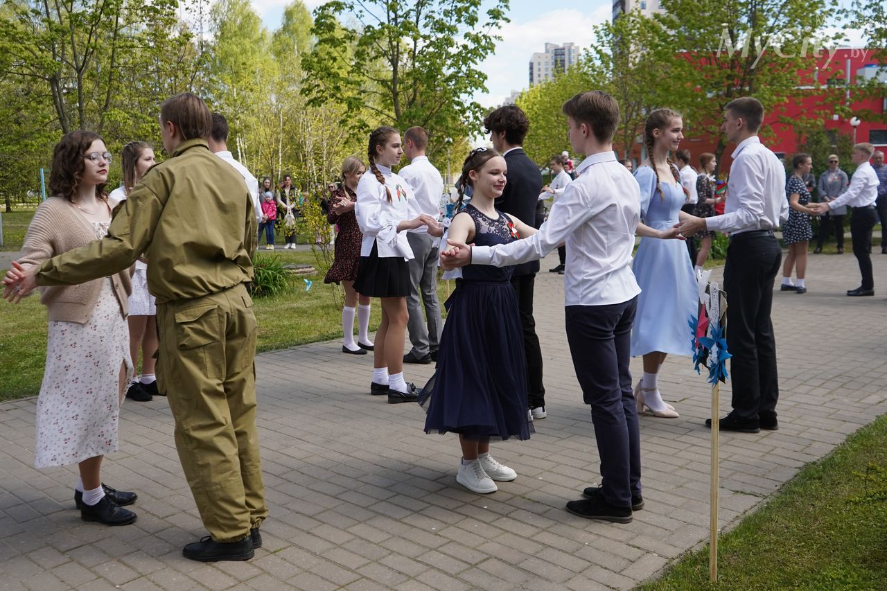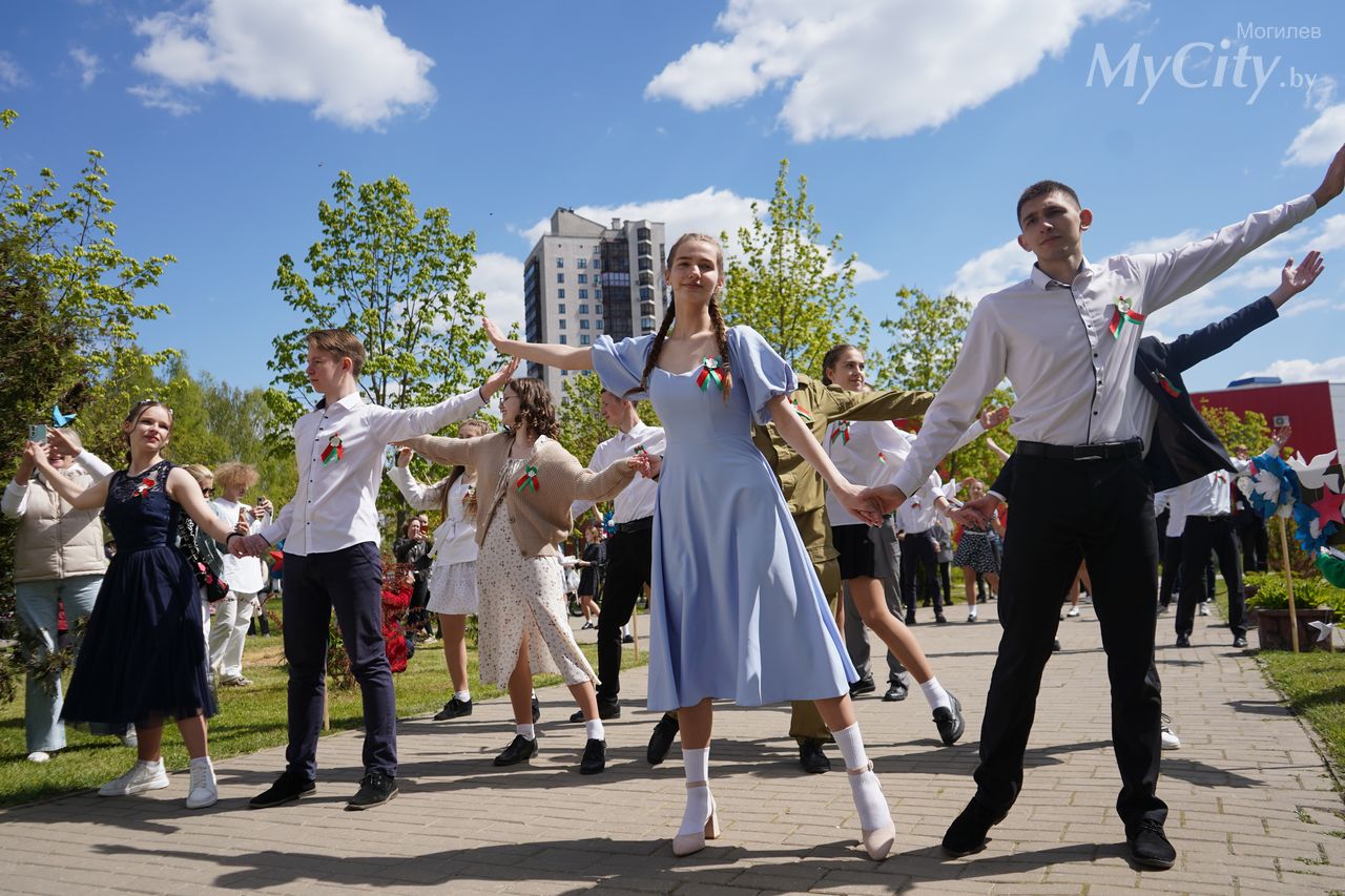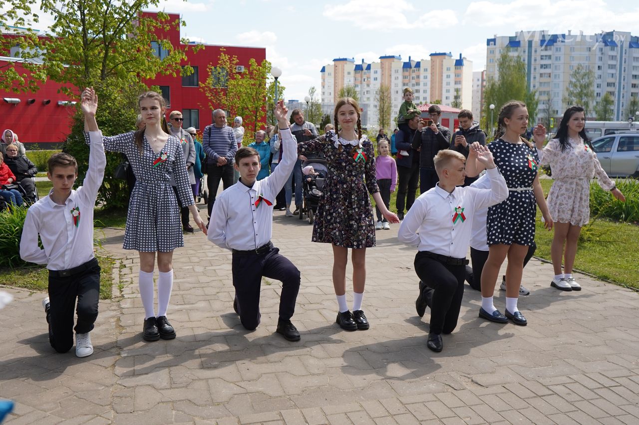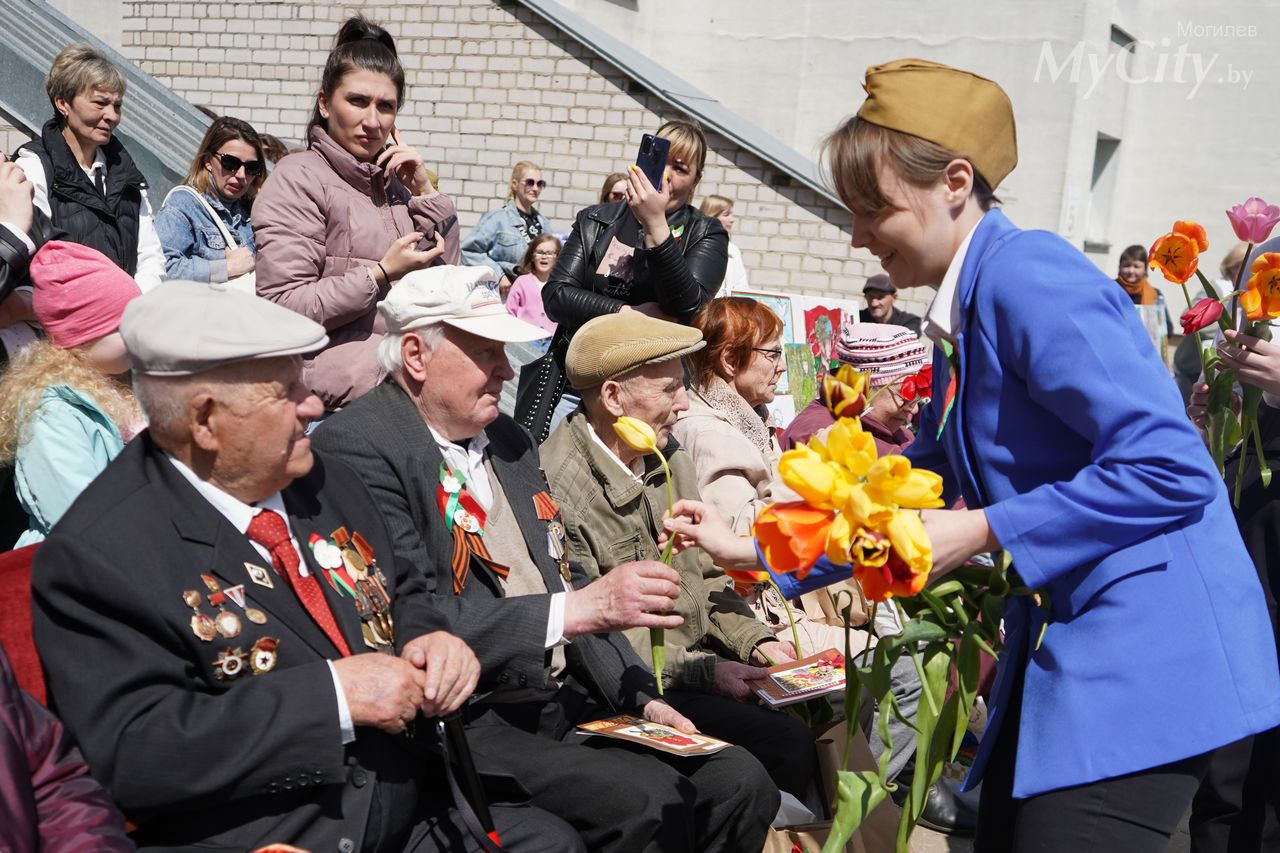 В Могилеве 13 пар из разных школ города станцевали «Победный вальс». Молодежным флешмобом ребята поздравили ветерана Великой Отечественной войны Федора Ивановича Кривоногова, бывших узников концлагерей, которые проживают в доме ветеранов, с Днем Победы.