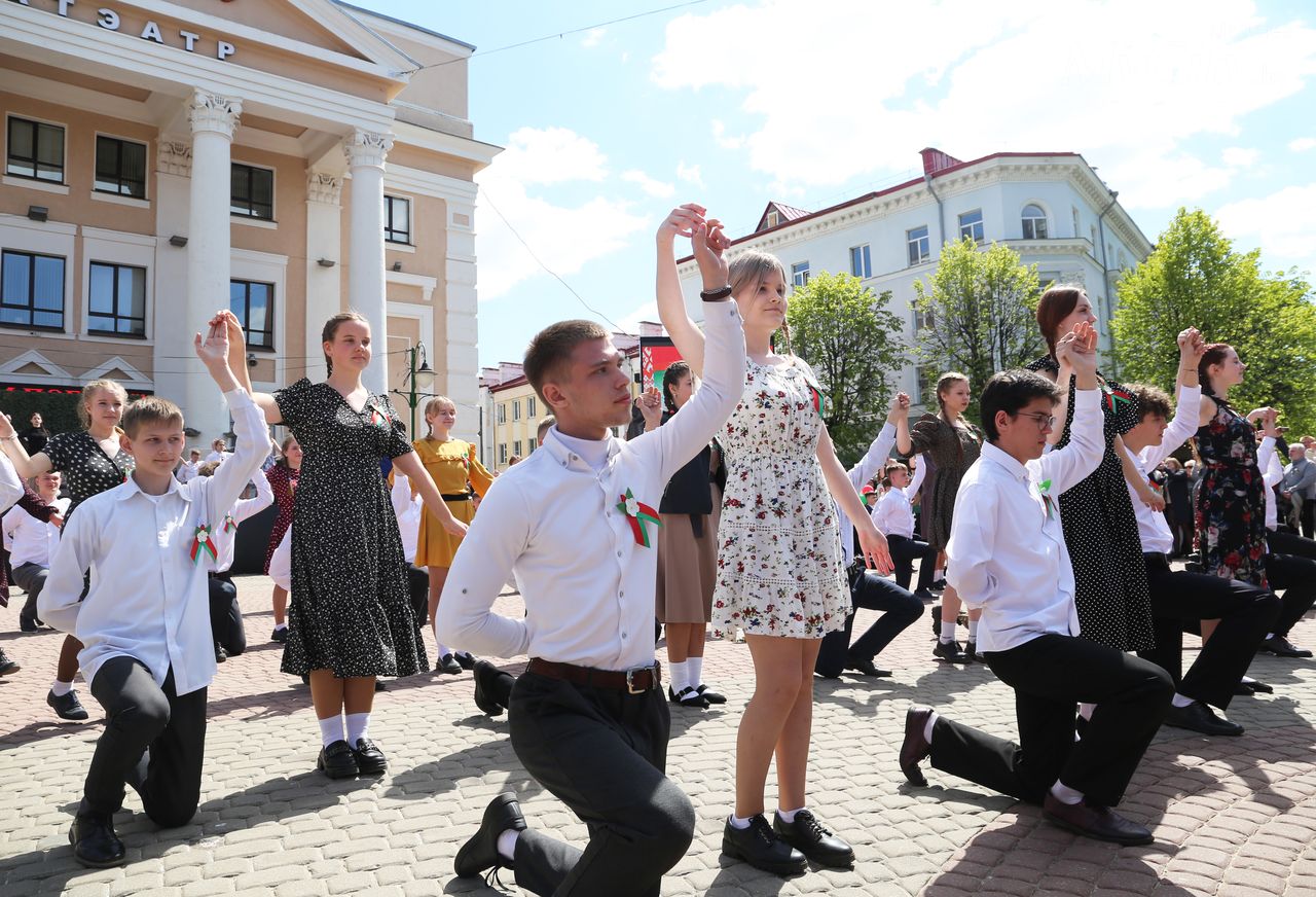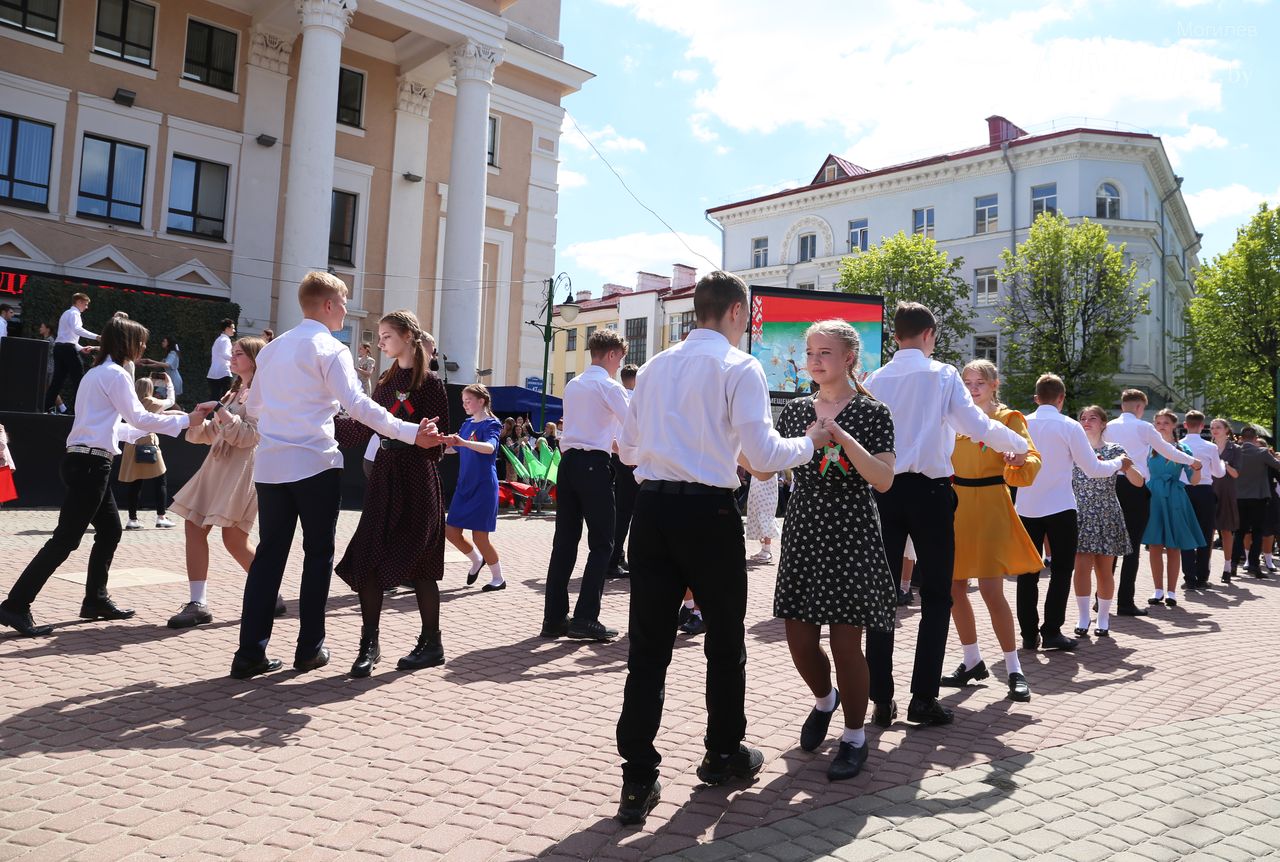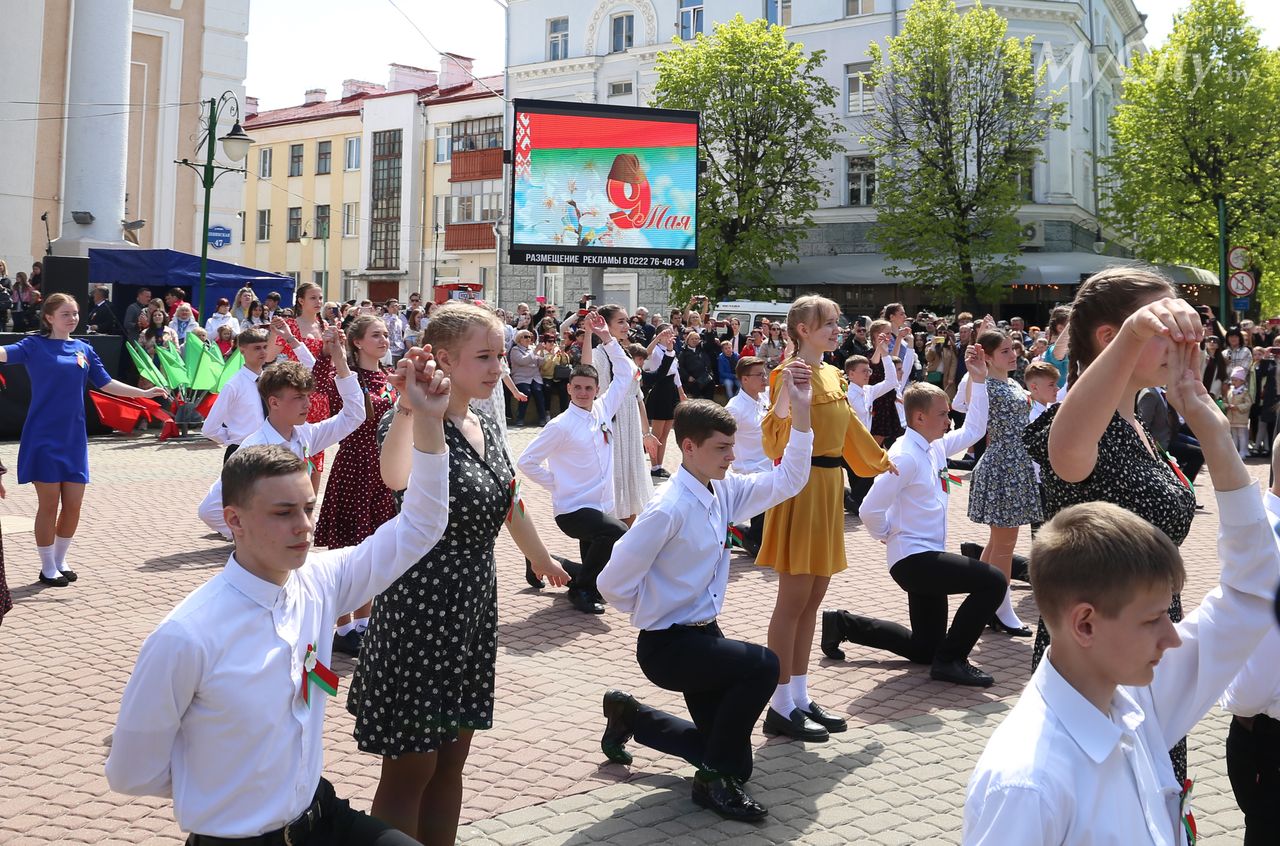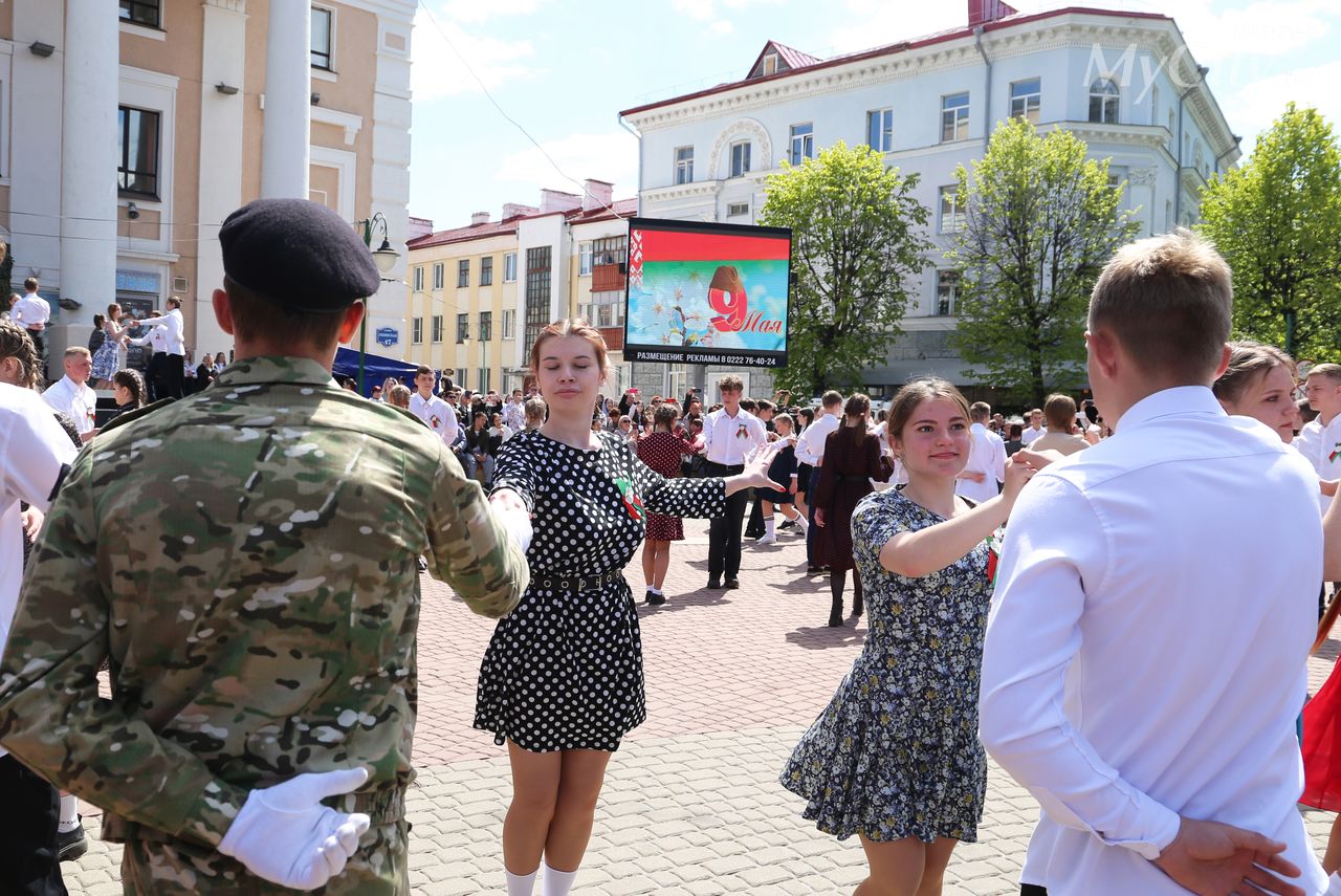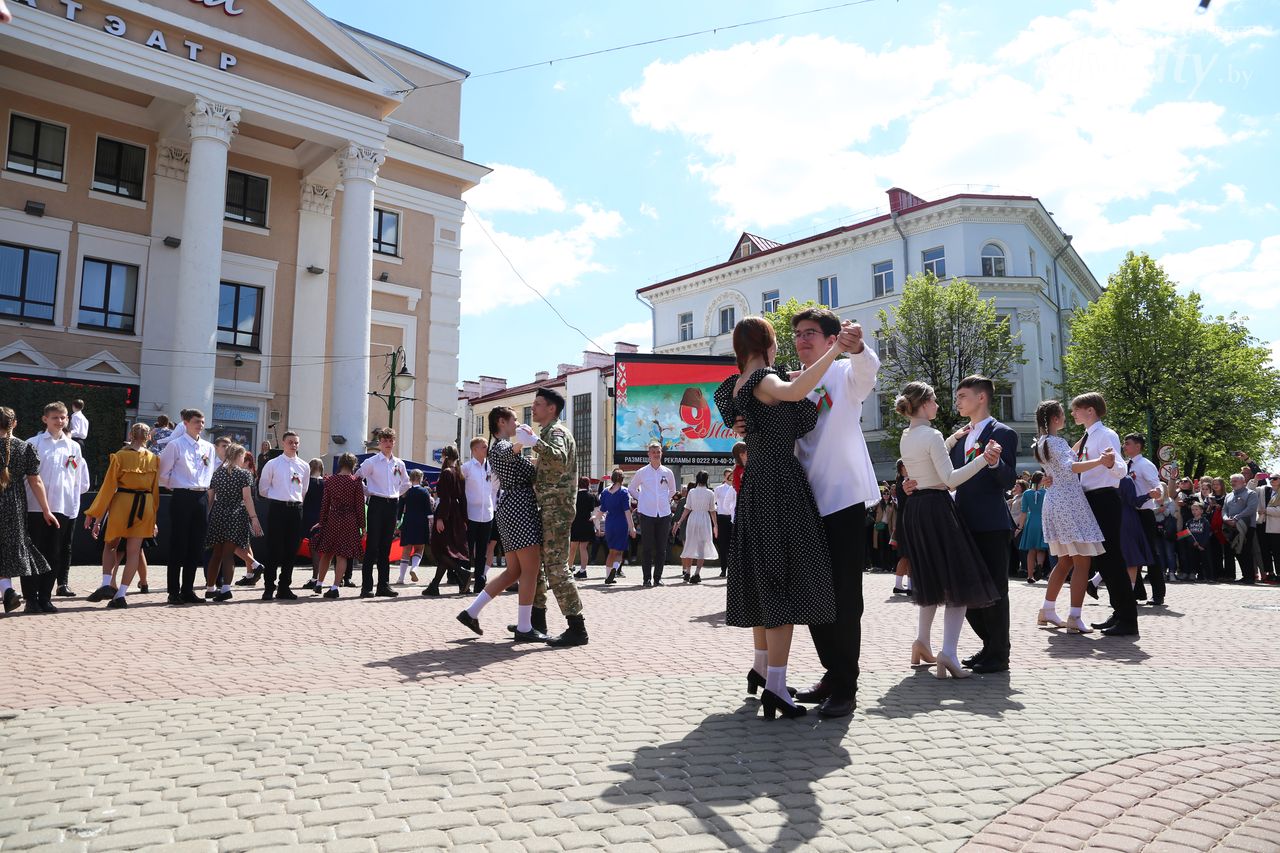 Городская акция «Вальс Победы» прошла на площади Звезд в Могилеве. Ее участниками по традиции стали учащиеся учреждений общего среднего образования города.