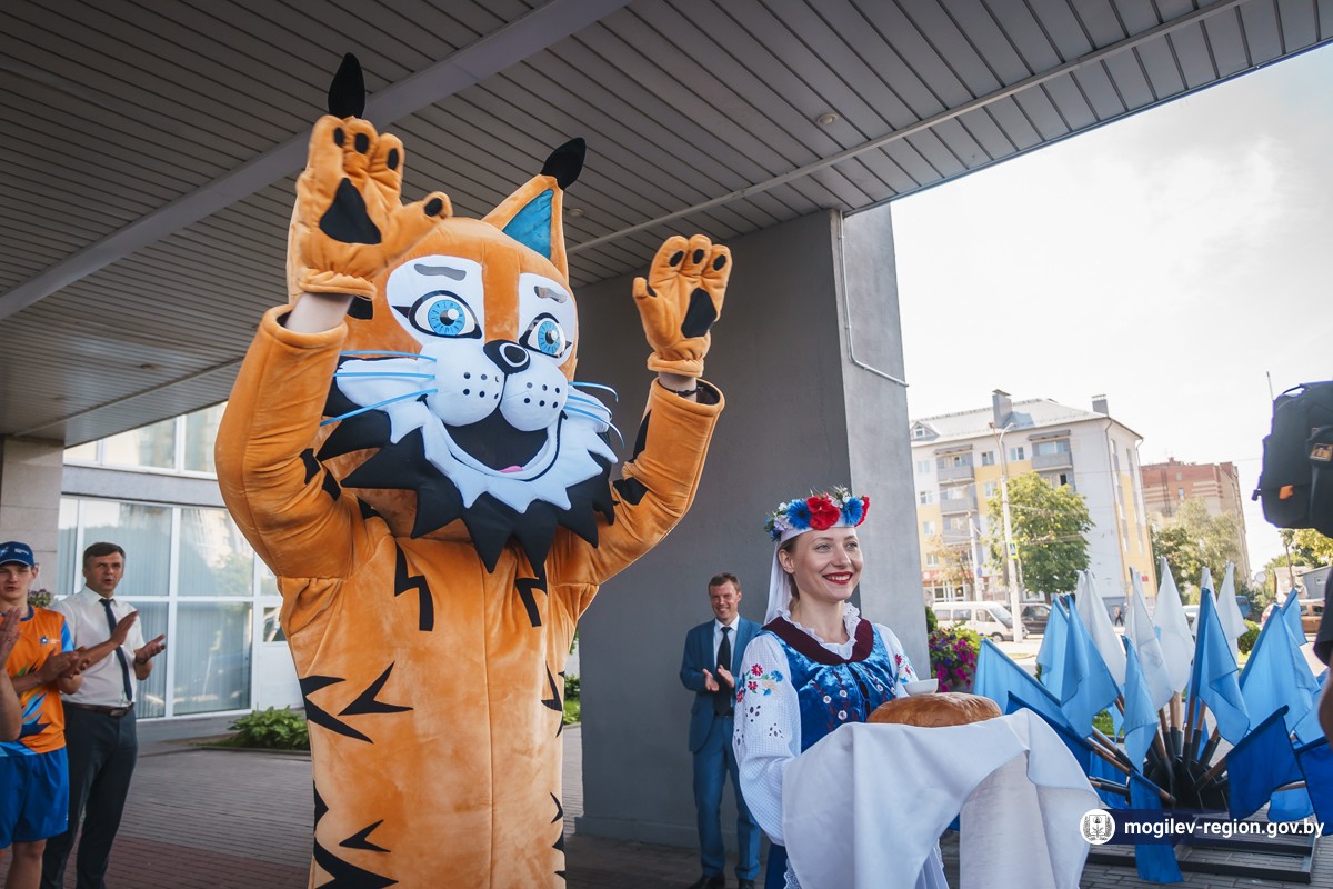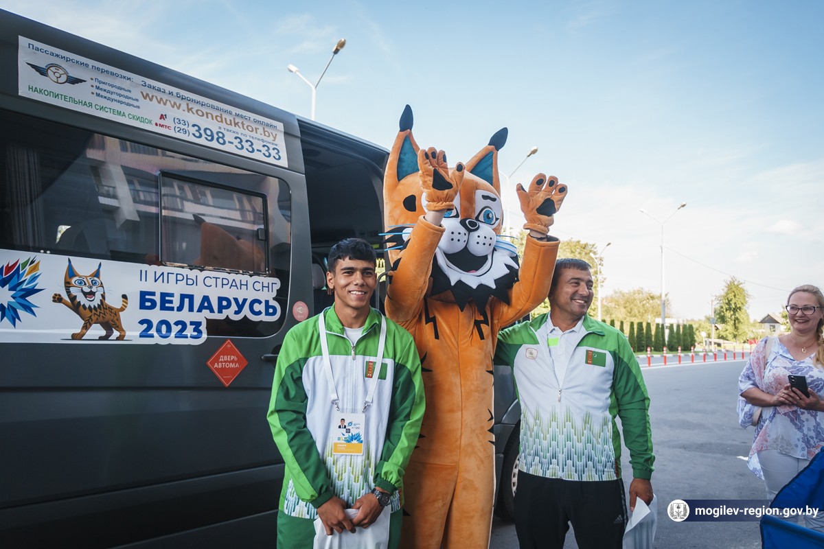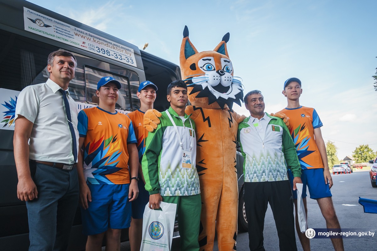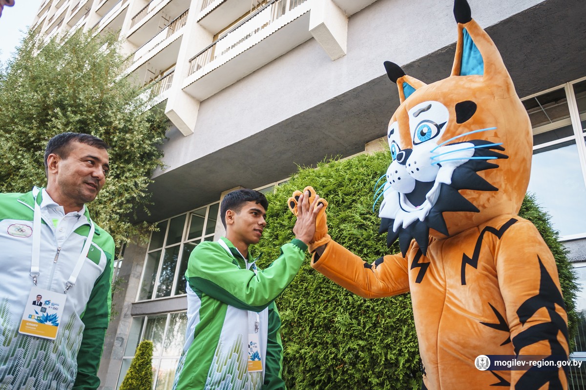 Первые участники спортивного форума прибыли в Могилев. Сегодня возле гостиницы «Могилев» делегацию из Туркменистана встречали начальник управления спорта и туризма Могилевского облисполкома Сергей Новиков, заместитель начальника управления спорта и туризма облисполкома Вадим Брежезинский, начальник отдела спорта и туризма горисполкома Дмитрий Латенков, представители СМИ, волонтеры, могилевчане, а также символ спортивных состязаний — Рыся.
