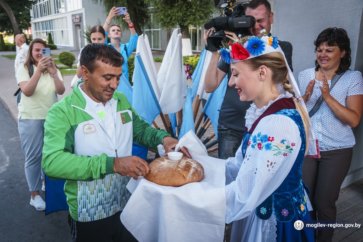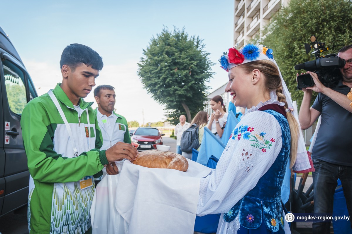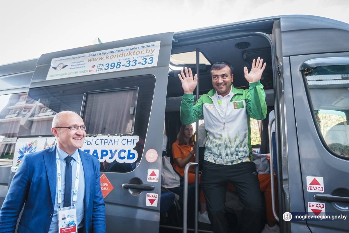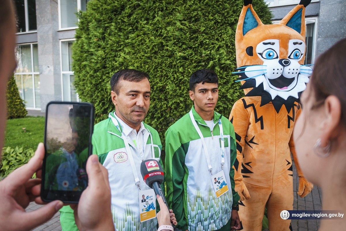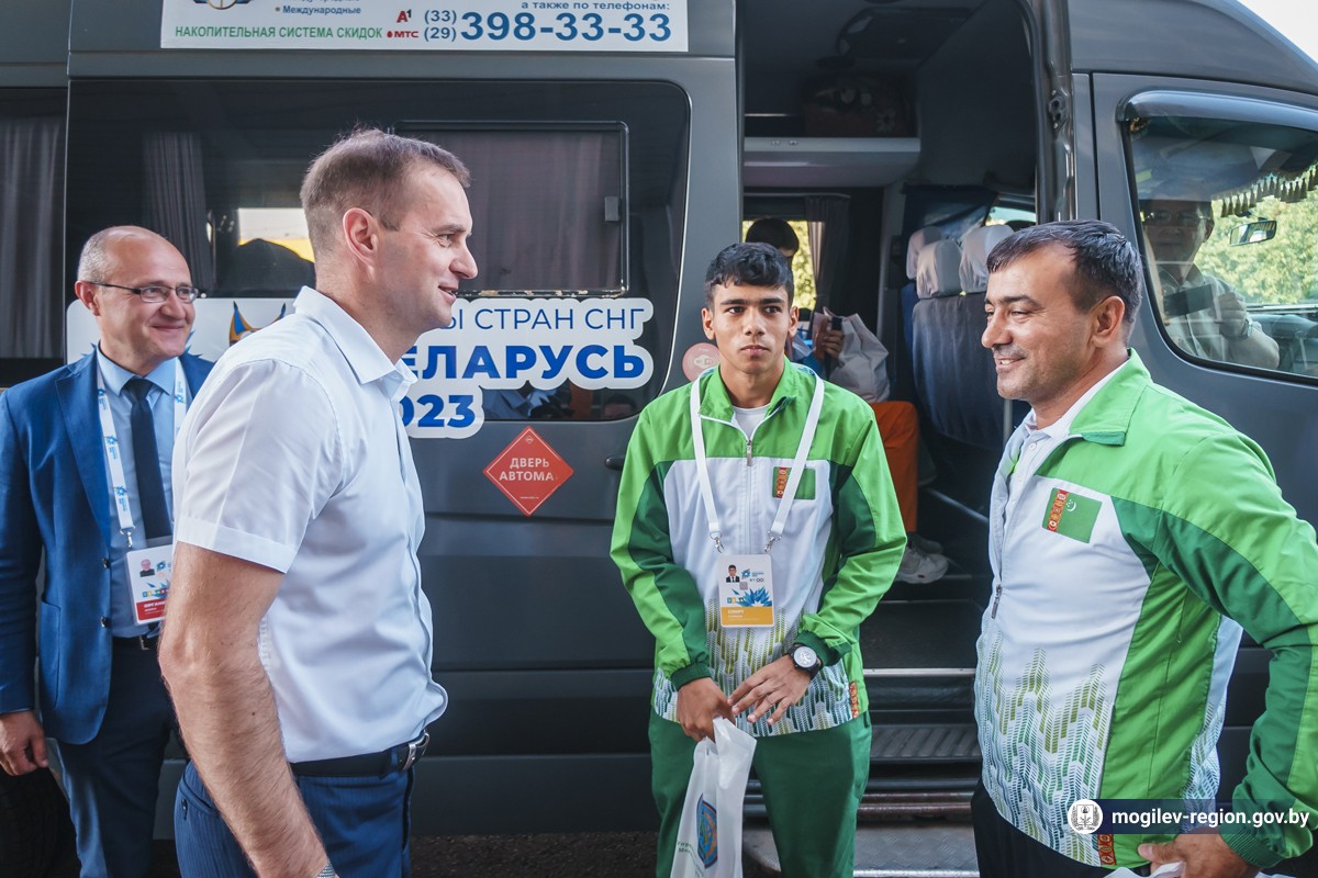 Первые участники спортивного форума прибыли в Могилев. Сегодня возле гостиницы «Могилев» делегацию из Туркменистана встречали начальник управления спорта и туризма Могилевского облисполкома Сергей Новиков, заместитель начальника управления спорта и туризма облисполкома Вадим Брежезинский, начальник отдела спорта и туризма горисполкома Дмитрий Латенков, представители СМИ, волонтеры, могилевчане, а также символ спортивных состязаний — Рыся.