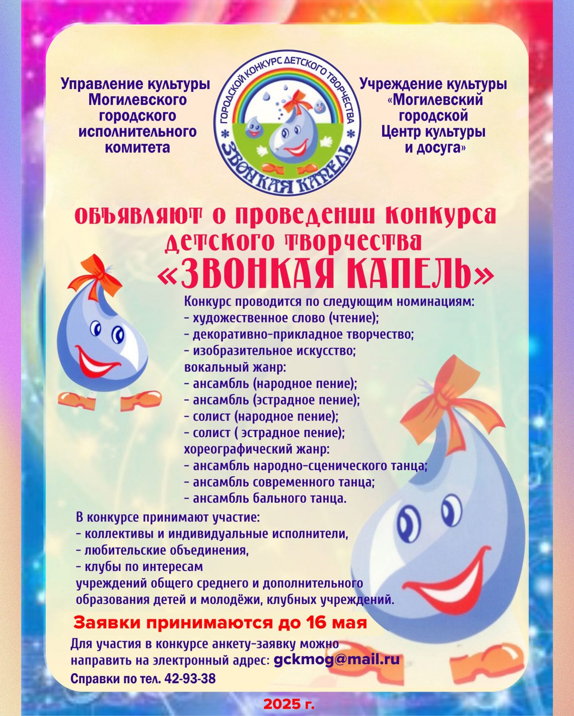 Городской конкурс детского творчества «Звонкая капель» пройдет в Могилеве с 21 по 23 мая на сцене филиала городского центра культуры и досуга (ул.Первомайская, 117).