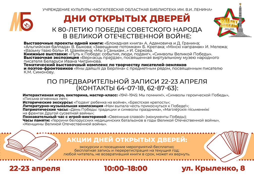 Дни открытых дверей, приуроченные к 80-летию Победы советского народа в Великой Отечественной войне, пройдут в Могилевской областной библиотеке им. В.И.Ленина 22 и 23 апреля. Об этом сообщили в учреждении культуры.